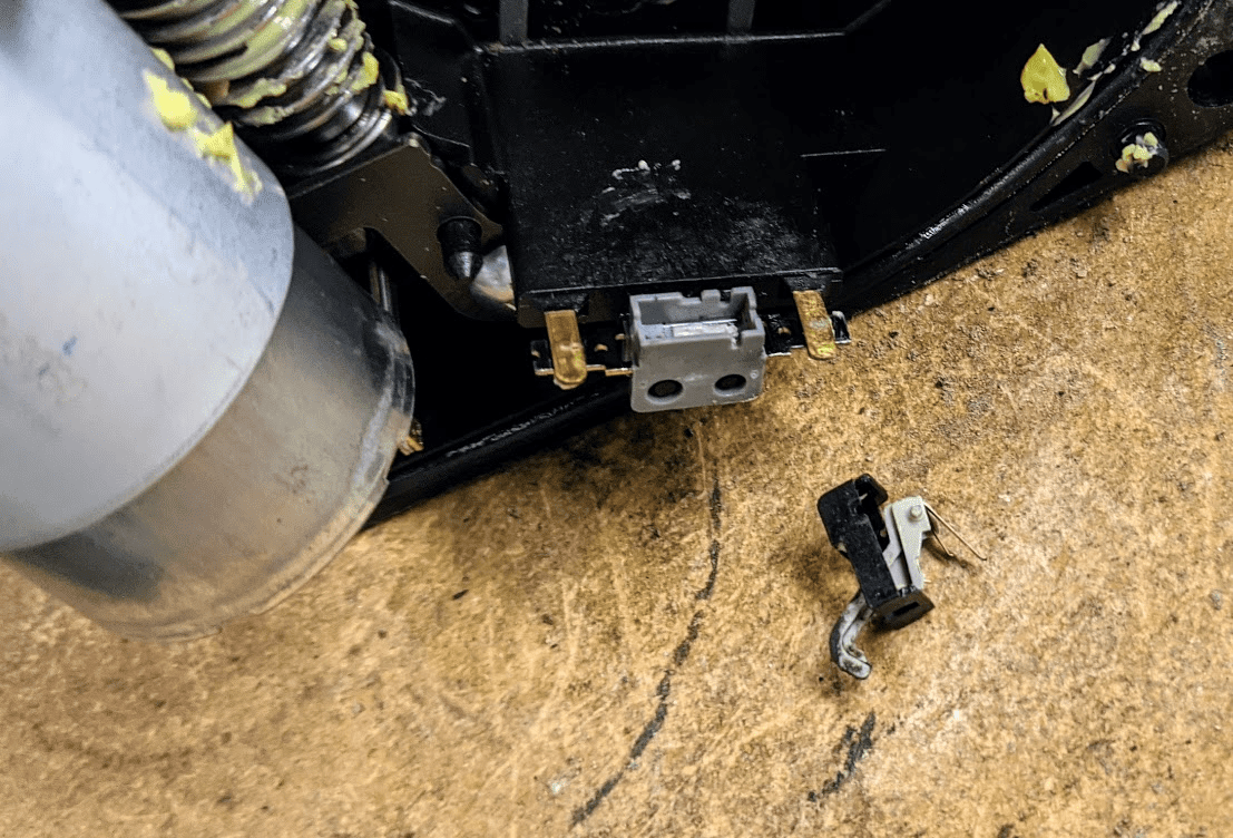 EDIT: couldn't help myself and went to Digikey. We are looking for a limit switch with solder lug termination, and what looks like one of either Formed, Leaf, or Simulated Roller style actuator. If you have the noble autismo to search further, or know someone who knows the terminology, please dive in.