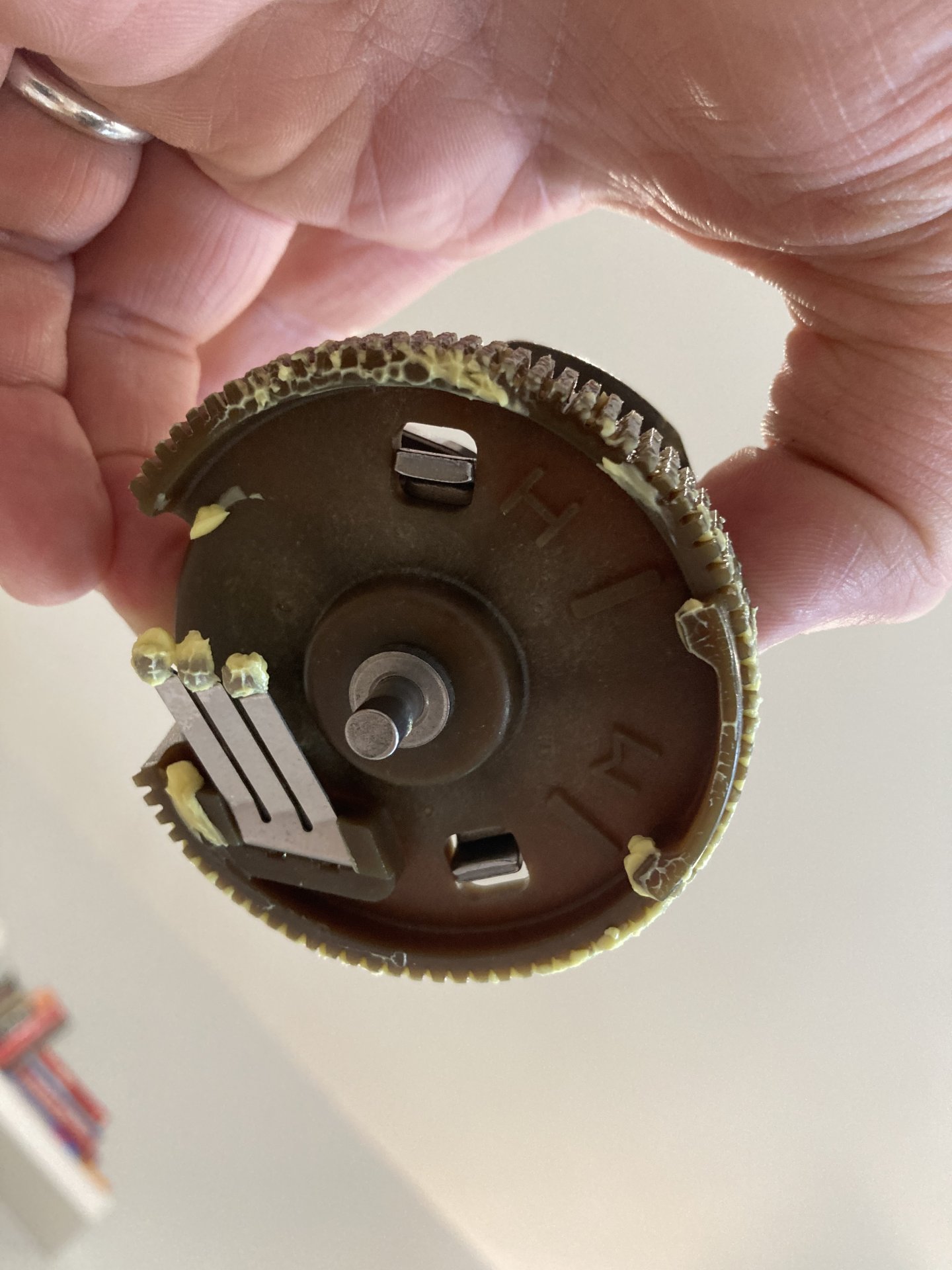 • the tiny plastic hinge allowed z-axis travel (orthogonal to intended plane of travel) of the platstic arm, making good contact at full-up or full-down positions but wildly inconsistent Ohm readings at its resting plane/position.