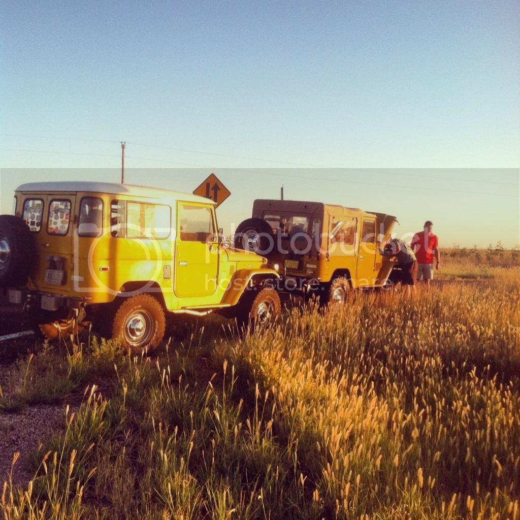 Just as we get 30 or so miles out of amarillo I hear Tucker over the radio "I smell rubber burning I'm going to pull over." We pop the hood see freon leaking out of the hose where it goes into the condenser. I'm not sure what happened but I figured we'll dig into that when we get back that must have been the smell. 5 miles down the road..."I still smell rubber burning " so we hit the side of the road again at this point I had tucker leave the engine running while I glance under the bonnet. we have an amazing sun rise. So my copilot snapped a few pics.