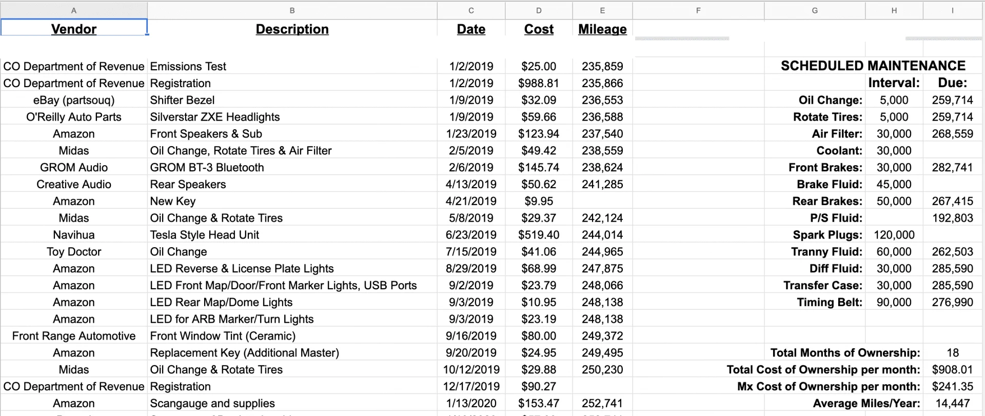 I use a separate tab for each vehicle, atv, zero turn mower, and tractor and email myself the file from time to time in case my server crashes.