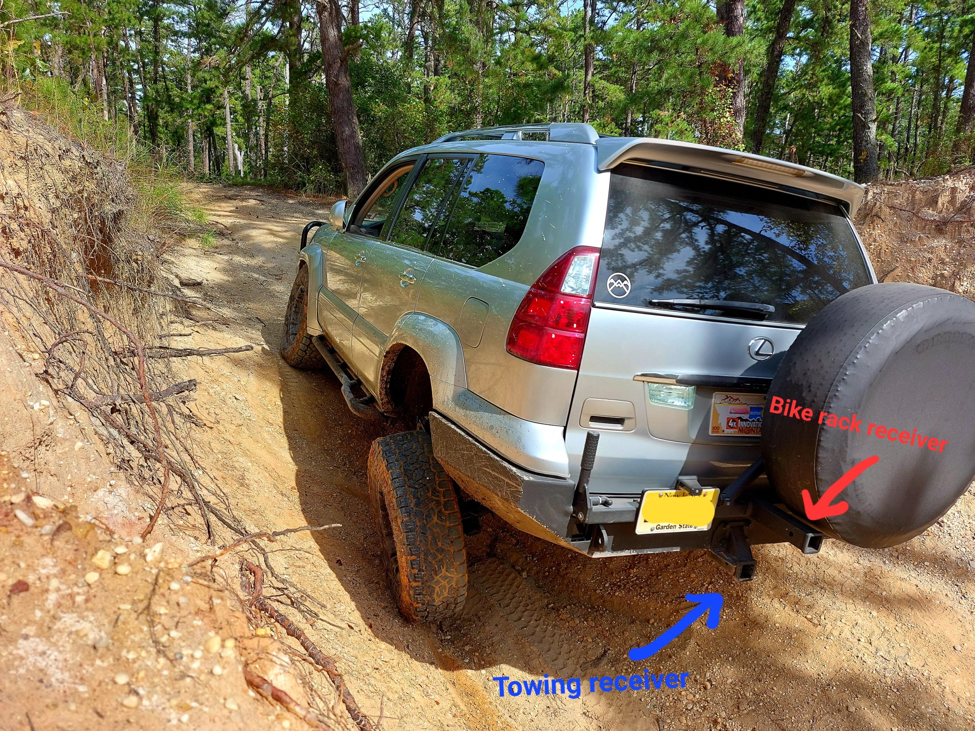 The 1Up you see in the picture is in fact the Quik Rack add-on adapter, which comes as a 1.25" with a 2" adapter. This allows me to carry 1 or 2 bikes. I also have the 2" Heavy Duty Quik Rack, which allows me to carry 2, 3 or 4 bikes. The medium worked perfectly for me. The large adds another 4 inches in length. You need to measure 34" from the left side of the receiver, to your right. On the GX, that would push the assembly too close to the right side of the vehicle for my liking. The RakAttach is 16" wide, pushing you bike rack that much further away from the rear door. My GX's barn door opens left to right, so I chose to have the swingout in the same direction. My FJC's door swung right to left and there would be plenty of room to clear the rear mounted spare. The only question I would have pondered, was whether to have Walter (RakAttach) reverse the swingout to the left (available option), or have door and the rack open in opposite directions.