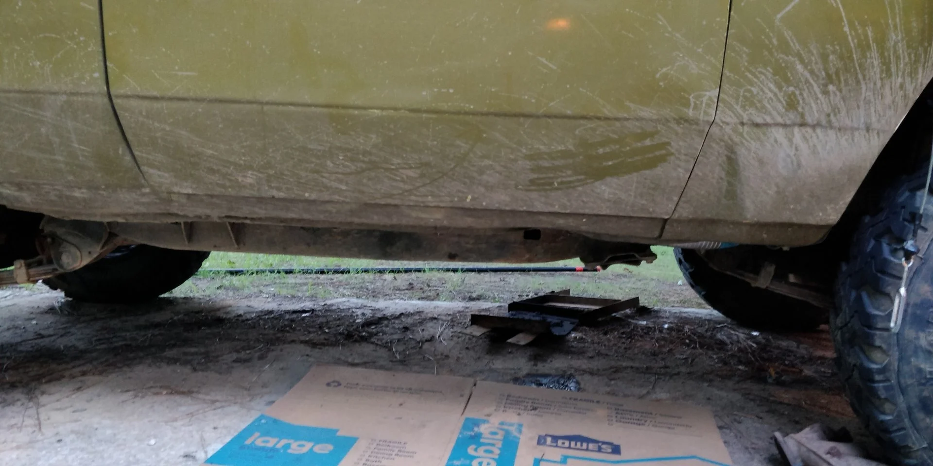 Finally got around to fixing some damage I did a while back in Uwharrie. Kissed a rock with the right rocker panel denting it upwards a bit and partially crushing my exhaust tubing where it went underneath the factory exhaust hanger protruding from the frame. I also mashed my Expedient skid plate into contact with the transfer case some engine vibes have been going directly to the frame making noise for some time.