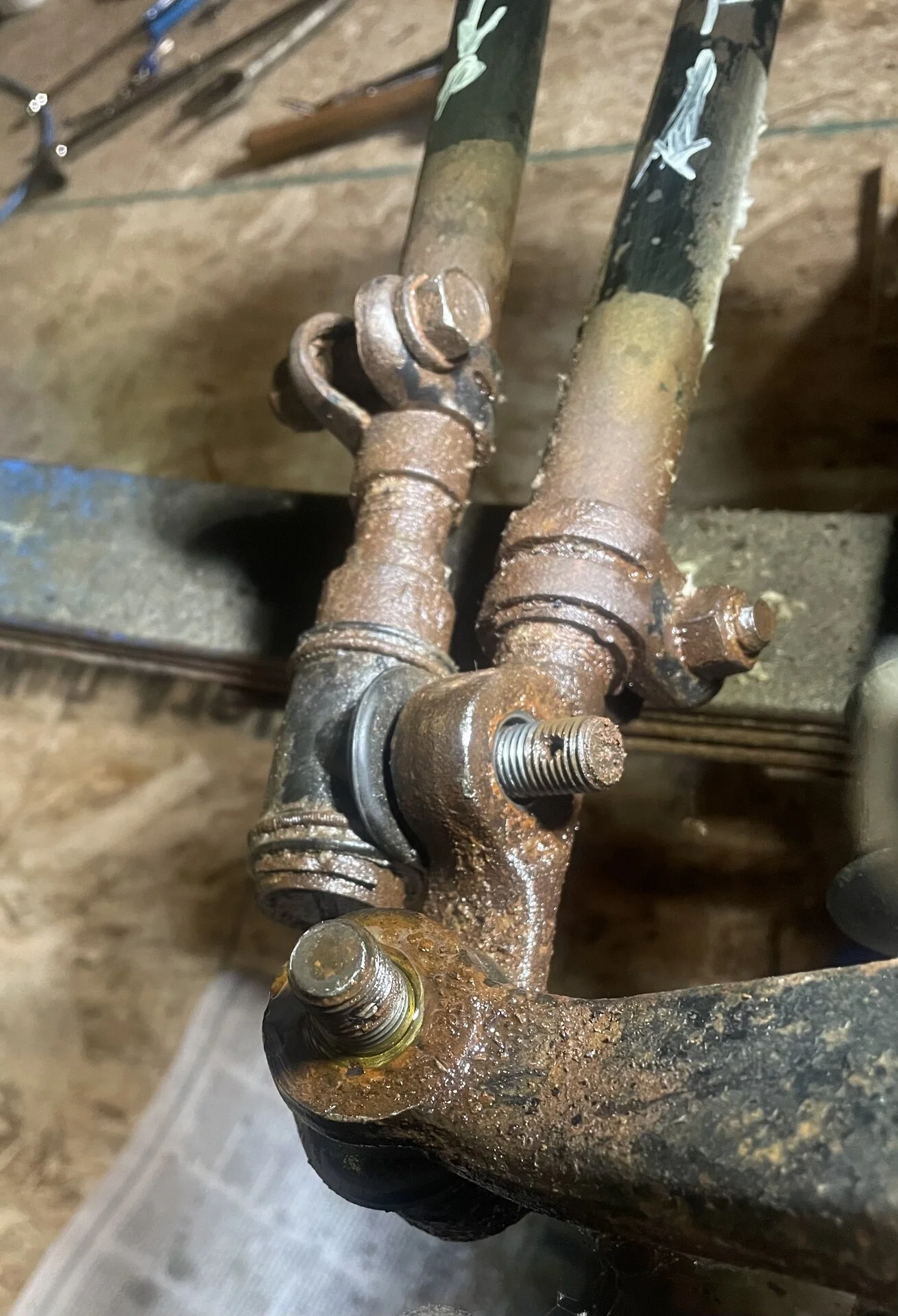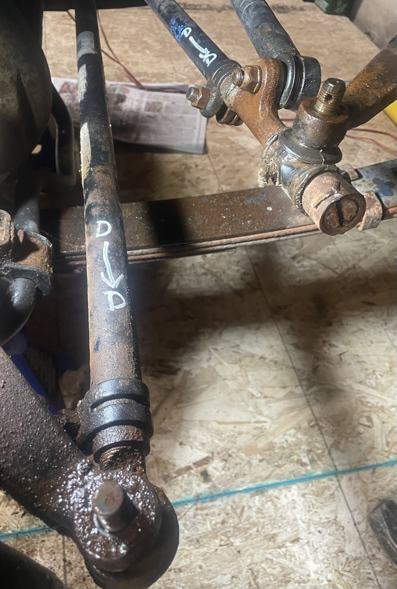 I started to take apart the steering linkage to replace the relay rod and tie rod ends and the steering damper. I got all of the castellated nuts off after having to deal with super rusted up cotter pins. I tried to use a pickle fork on the relay rod/pitman arm ball joint … no dice. Picked up a screw lever type at Princess Auto. Will try it, hopefully tomorrow.