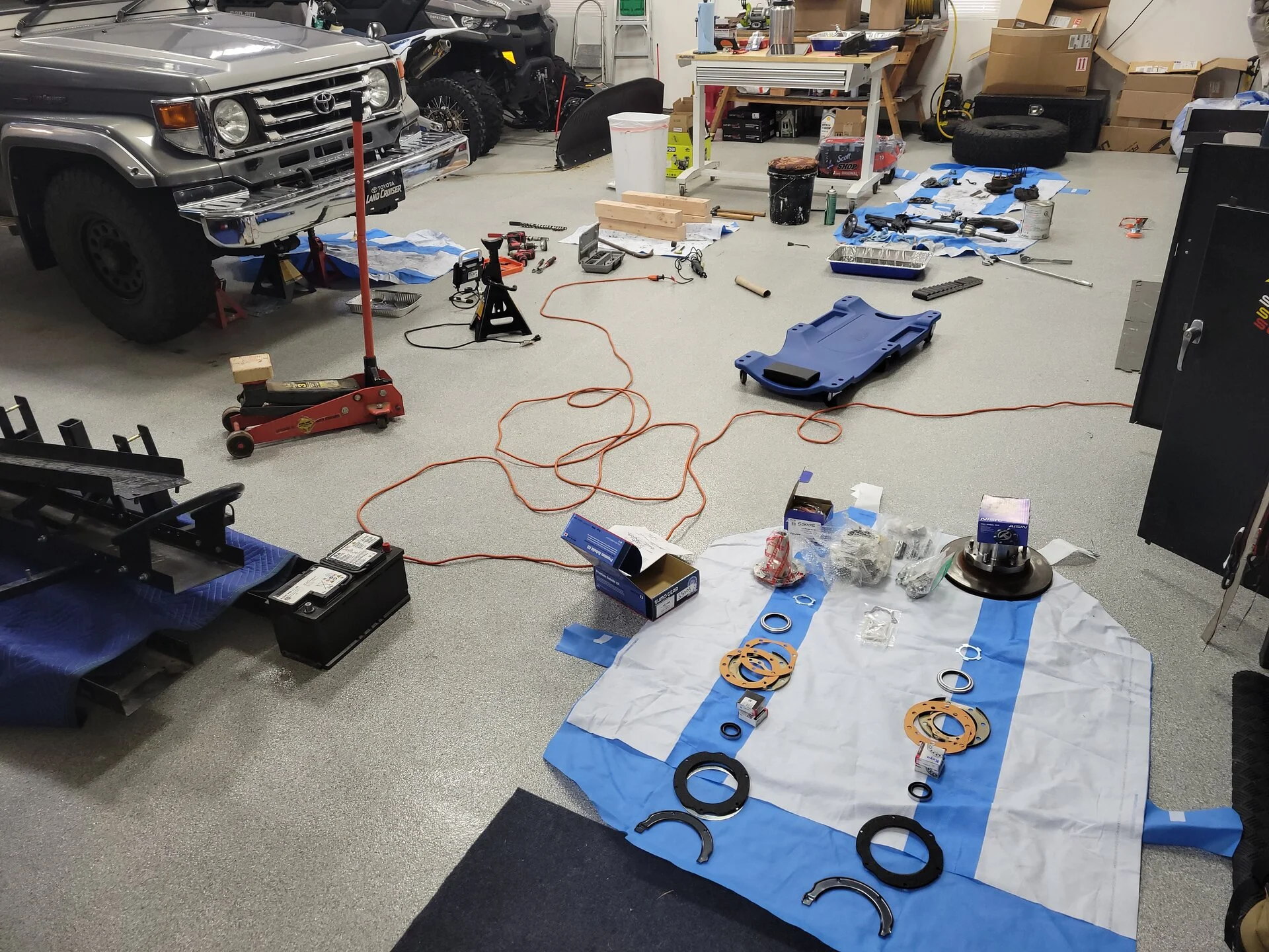 …oh for that much garage floor…Balls deep in this swivel hub Rebuild/manual hub conversion project on the hzj73. I found that the knuckle arm where it mounts to the steering knuckle did not have any shims. There was one shim under the bearing cap (lower side of knuckle). This is opposite what the FSM shows. Is this a problem or is it just different on different trucks depending on what tensions them correctly?