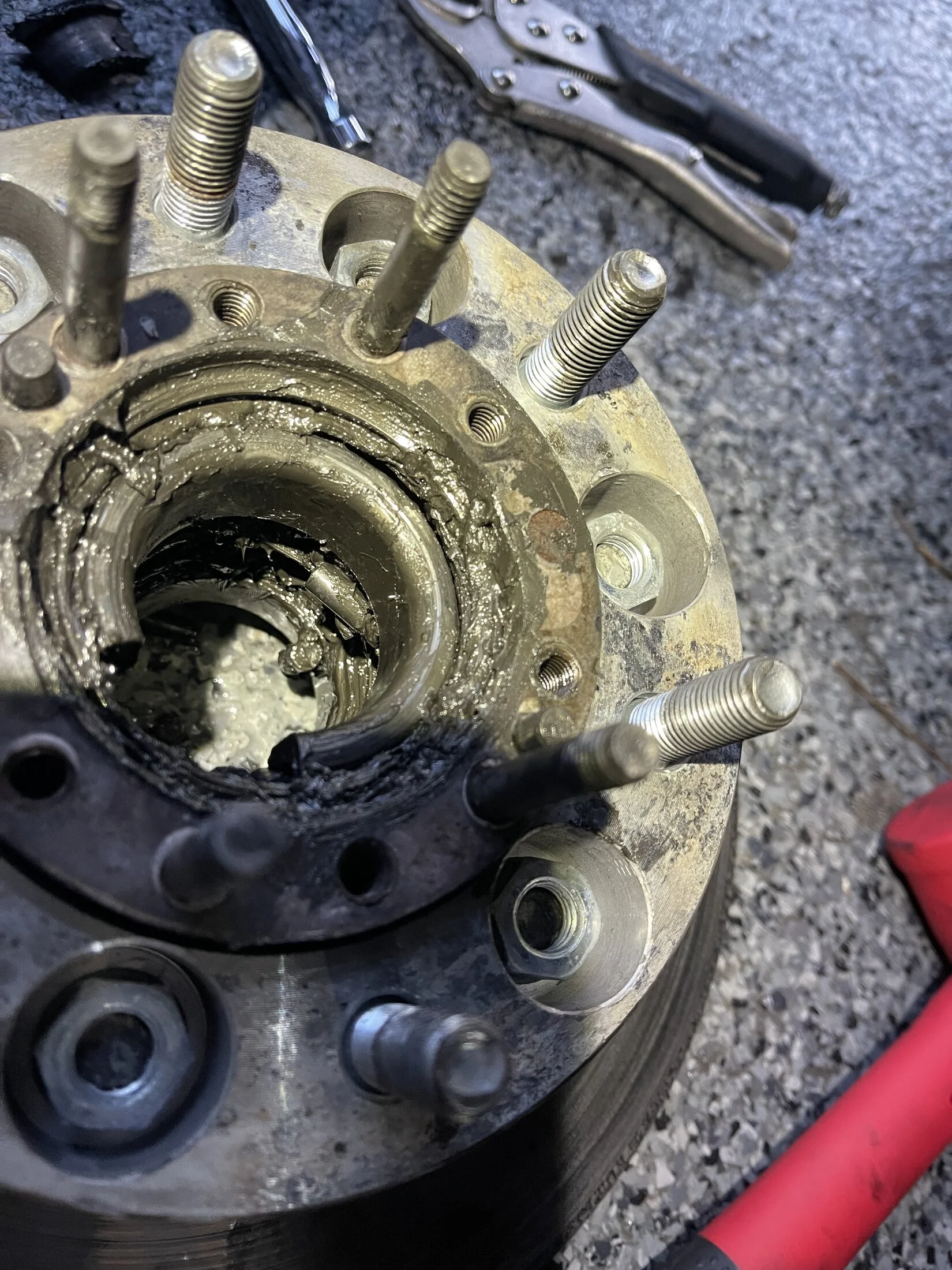 The keen eyed of you will notice loose rollers sitting here. This is right after removing it. The inner race of the outer bearing broke but was holding its shape while on the spindle. This was probably the noise I heard hahaha.
