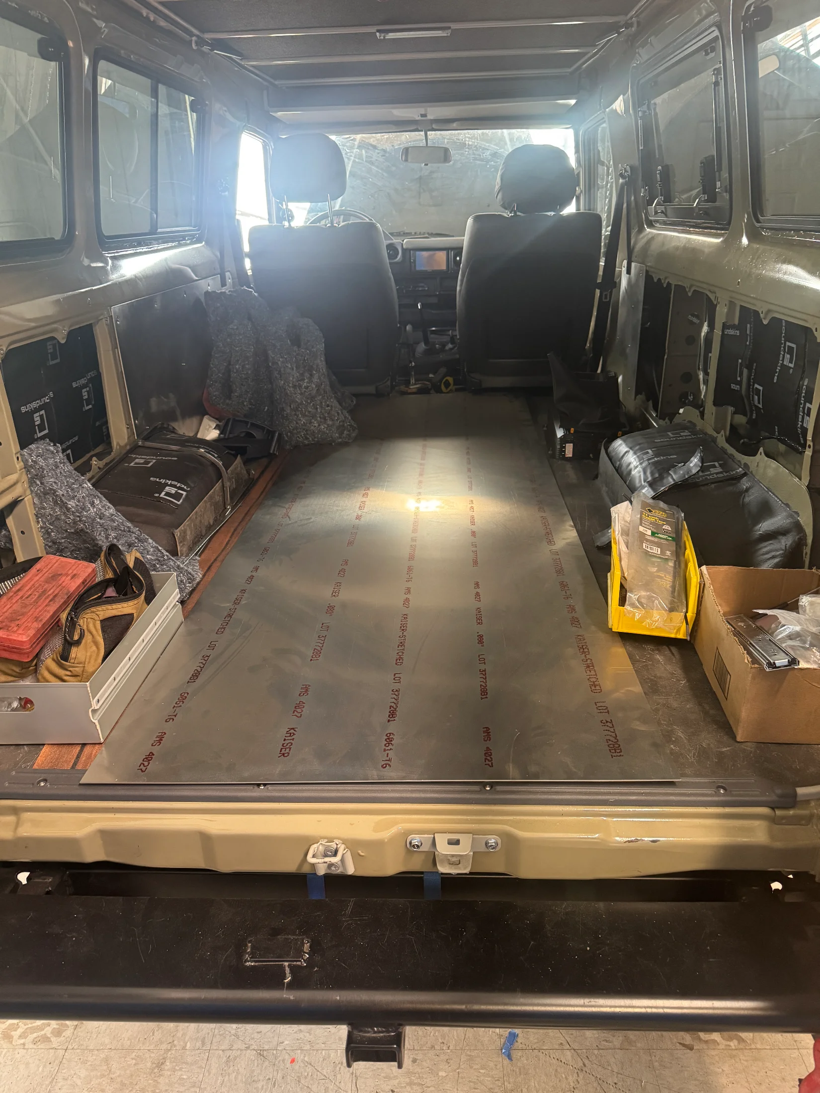 Spent $200 on an aluminum 6061-T6 2mm thick. Tariffs!!! Will go under the marine vinyl floor since the truck has corrugated floors. Probable bedline it on both sides. One more layer (number 5!!!!).