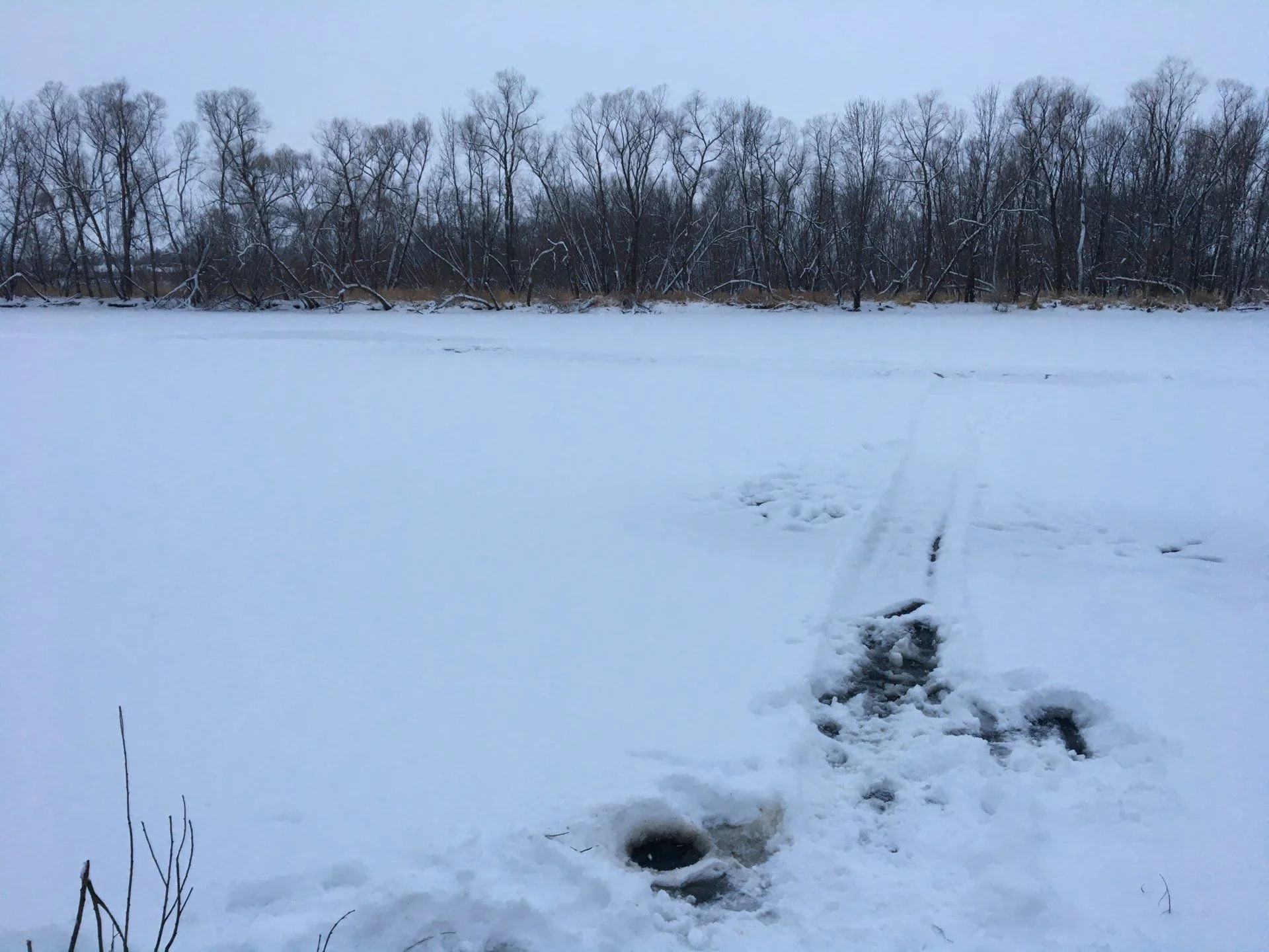 Attempted to go ice fishing. Saw tracks so thought the ice might be good. It’s been below zero with no snow for a solid week. Drilled a test hole by shore. 3.5”-4”. Then looked closer towards the middle of the pond.