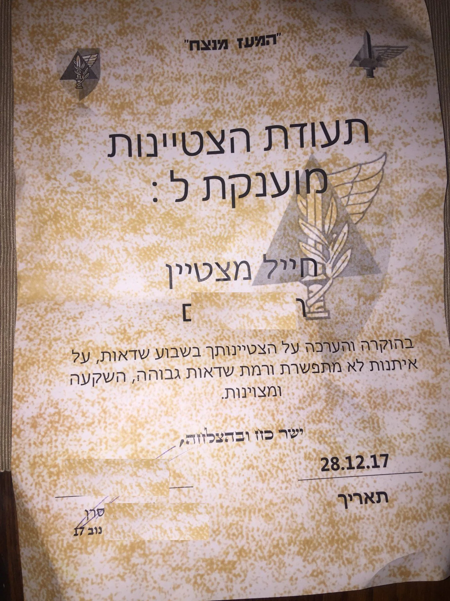 Thursday evening I get a phone call from my boy asking me pick him up train station I was waiting for a long time in railway station can't see my boy until i see one soldier standing there with a Full beard (normally not allowed in the army) all men beefed up posture he just wanted 2 lbs of cheeseburgers a cola hot shower and to sleep and he handed me a Certificate of Excellence
