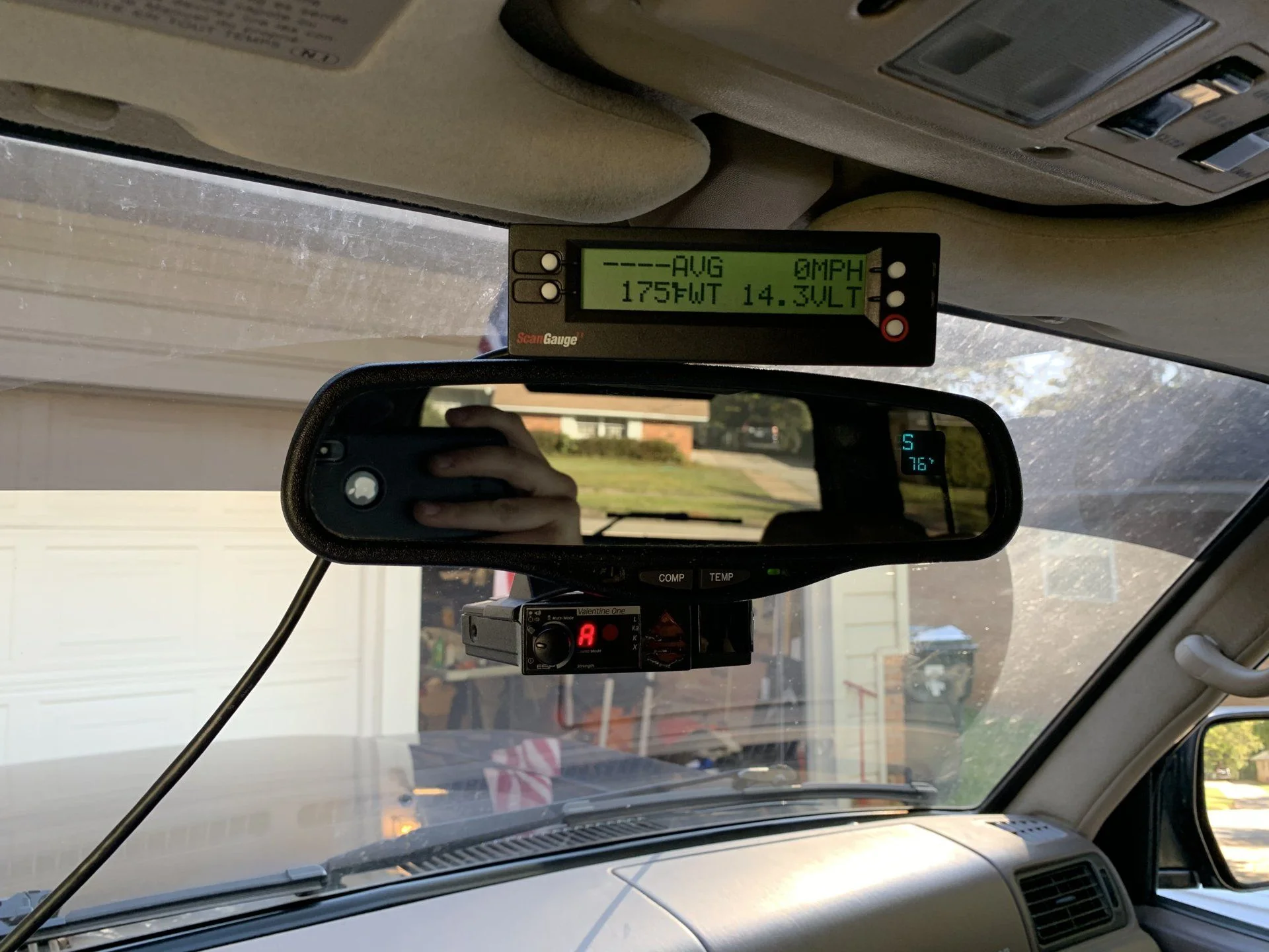 I also moved my ScanGuage from the steering column to the Wits End mirror mount. I took the back cover off of the ScanGauge and drilled a 1/4” hole to accept a 1/4-20 button head cap screw that went into a RAM ball (HD only had 3/4” long screws, so I stacked some washers for the time being). I then used a short RAM arm to another RAM ball coming off the mirror arm. There’s a lot going on around the mirror, but at least it’s all in one spot now. It does make the driver side visor unusable for the time being. I’m going to modify it. Also is not all wired up yet as I need to get an ethernet coupler and make a jumper cable to make it up to the mirror from the driver’s footwell.