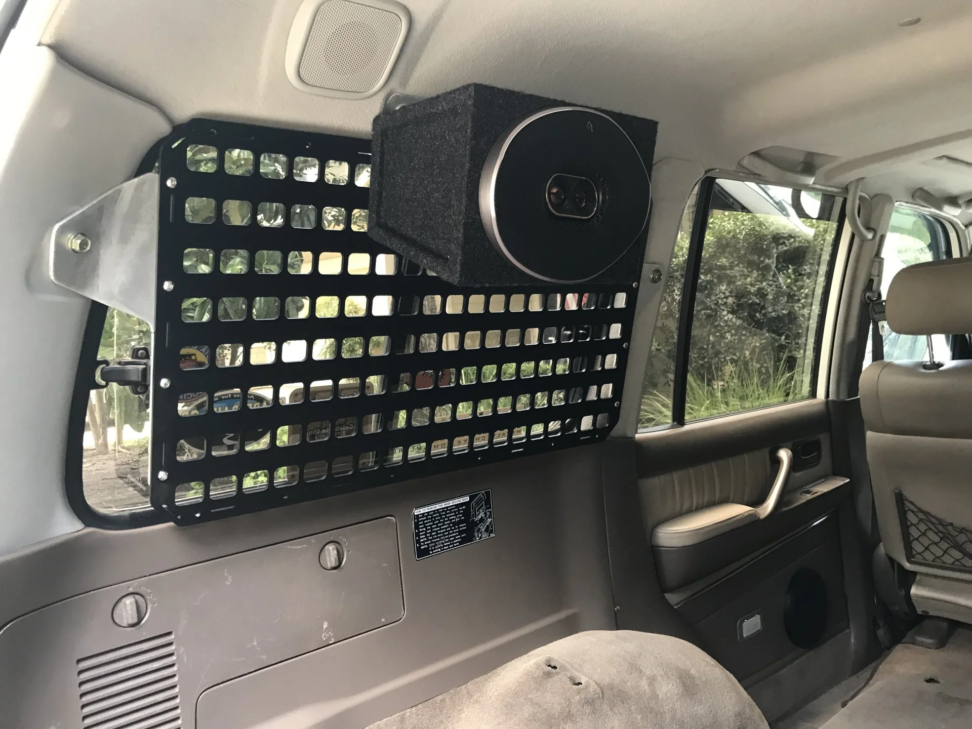 There are a wide variety of MOLLE based pouches and bags that I can load onto the panel as well as quick fist straps. I went with the largest panel that Gray Man Tactical had in the more rigid aluminum. Link here. Mine relies on both the second and third row seatbelt bolt locations so if you have second row seats installed you'll have to adapt it to your situation.