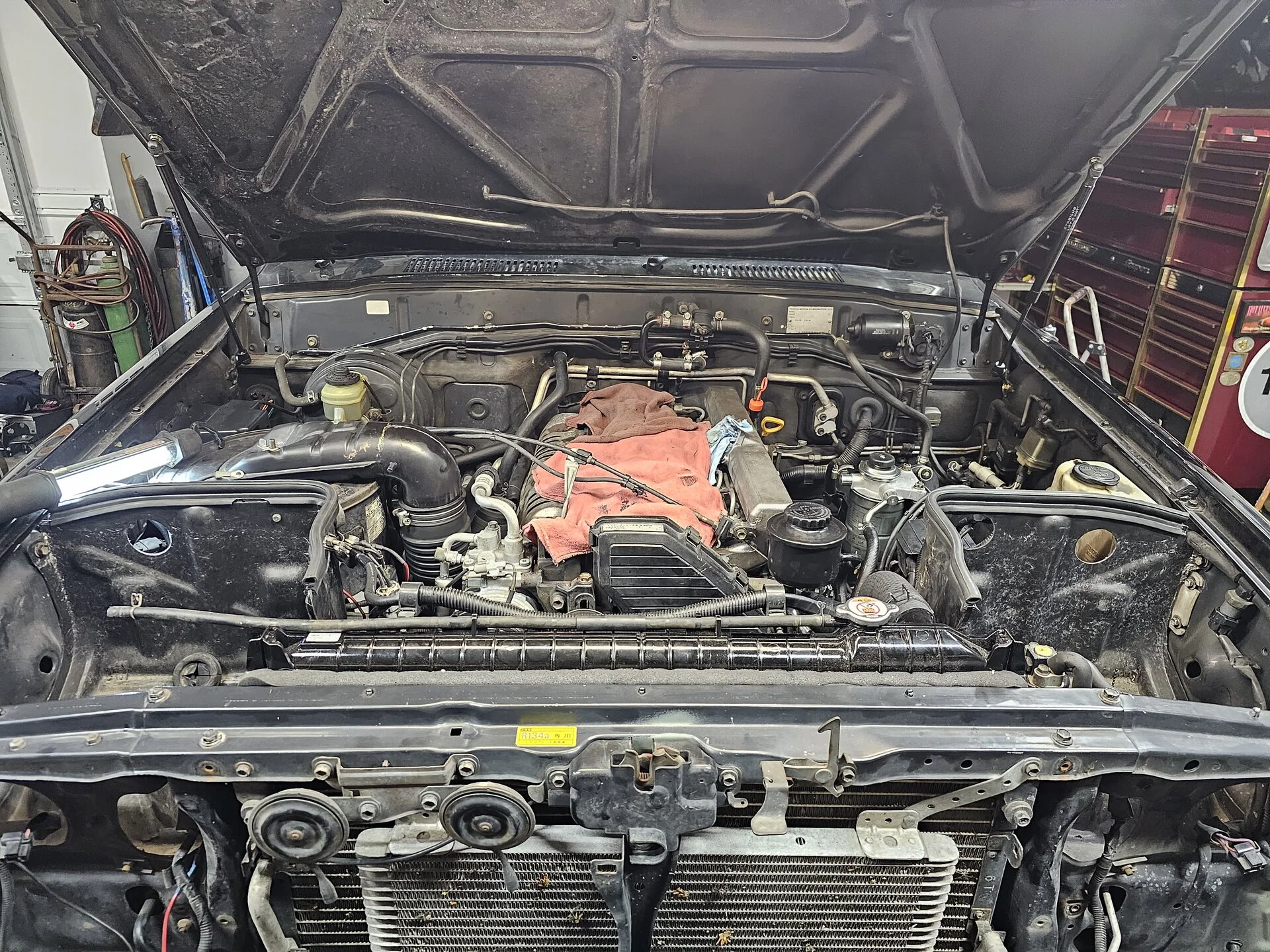 Radiator and timing cover back in. Battery boxes back in. Still waiting on shims.