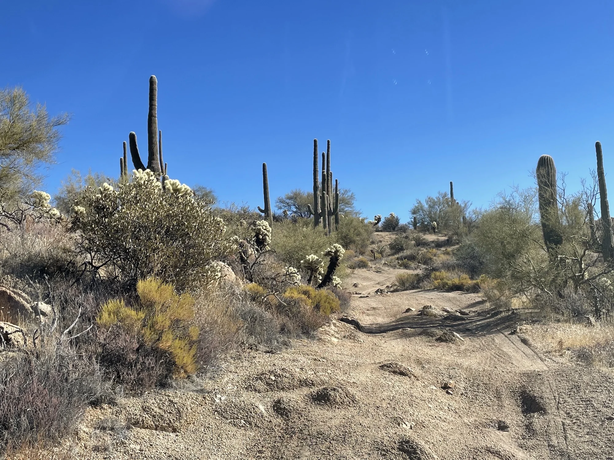 We call this our 'Christmas Place' since we typically visit here at Christmas time. Downtown Phoenix is straight ahead between the two mountain ranges, last range on the horizon I believe is the Sierra Estrella; South Mountain is hidden by the haze & smog. I've walked the trail a bit higher up, and it gets narrow with some off camber spots; probably drivable but the view doesn't get any better up there.