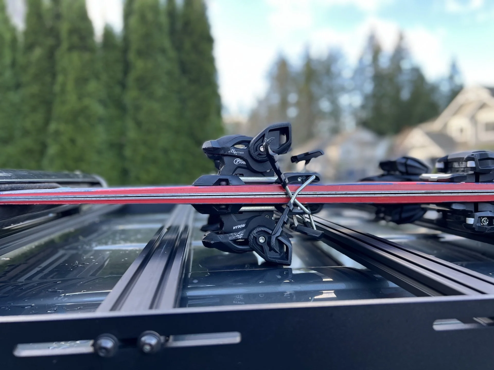Compared to the OEM roof rack with the same ski rack, it's definitely lower profile, so the bindings are closer to the roof. Here it's not touching, but really really close. As long as I have our kids skis in first and my skis on the outside, there's sufficient clearance because the roof isn't flat and bulges in the middle.