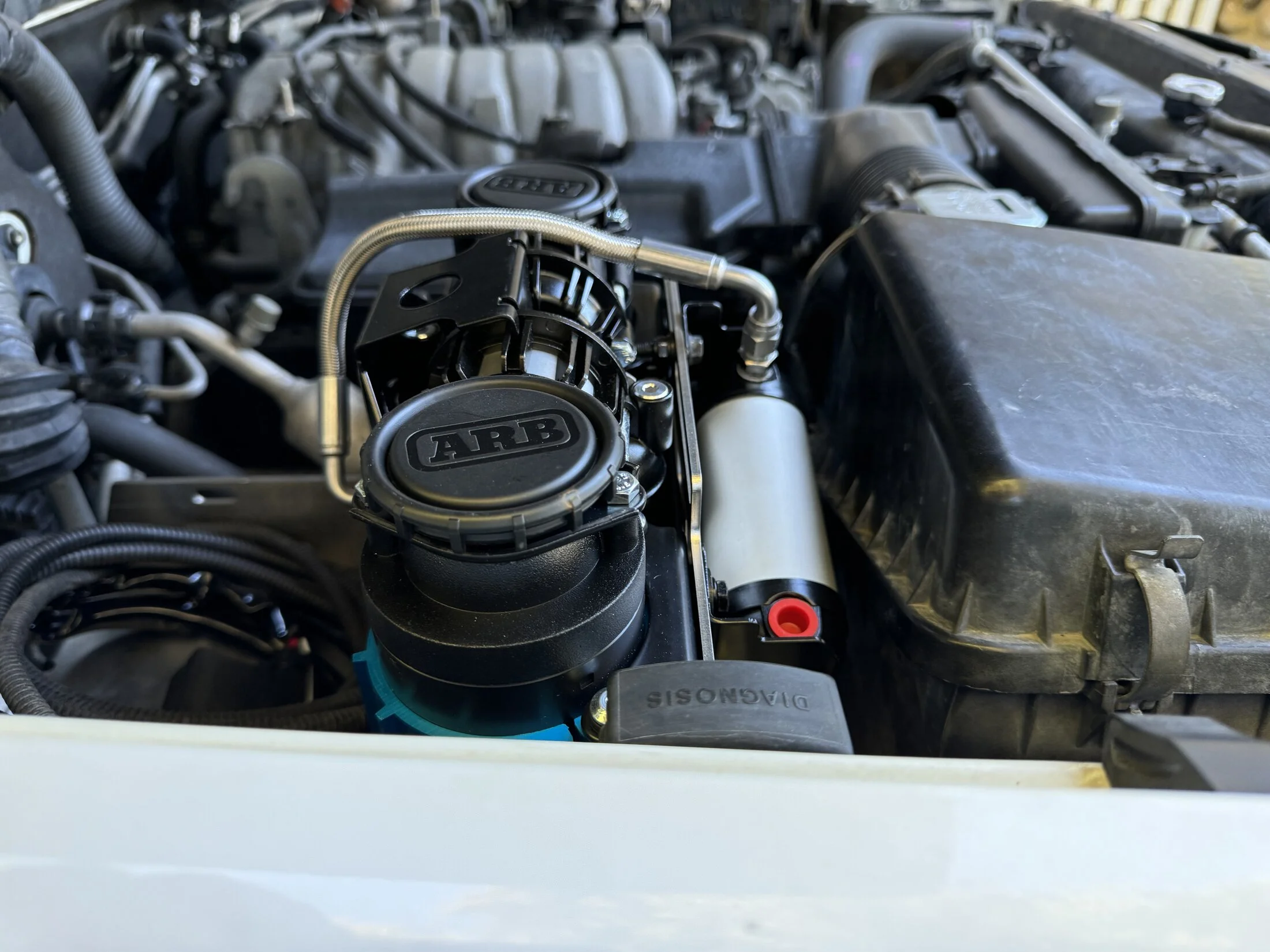 Knocking out some "leftover projects". First was installing the ARB Twin on the Slee Dual Battery Mount. Man... what a mass :-D took me ages to find a position where I could access all relevant bolts to secure it, have enough room to the hood, enough length of the tube from the compressor to the Manifold and the wiring on the ARB is so short I had to move the horn out of the way to plug the wiring loom in...