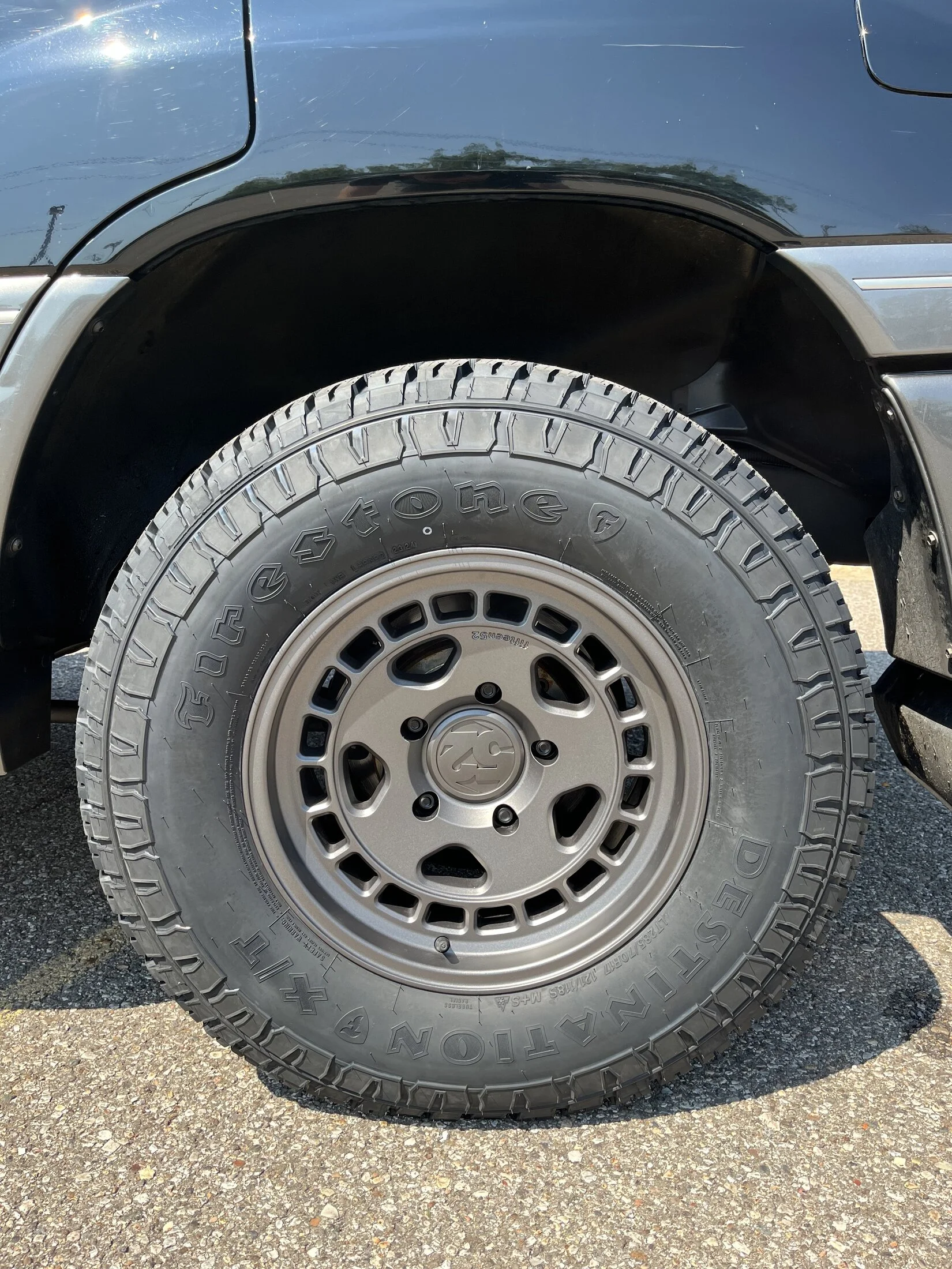 Tires are Firestone Destination X/Ts in 285/70 (about a 32.8” diameter).
