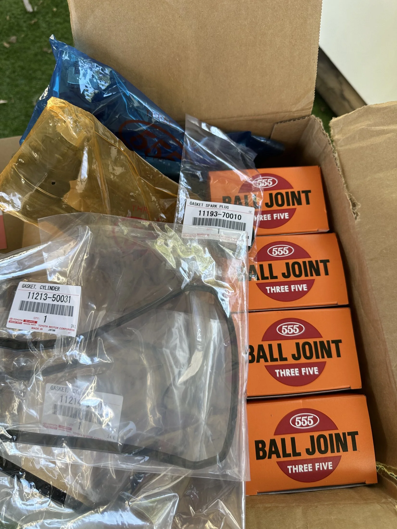 Got a box of parts from Japan overnight, full set of 555 ball joints and tie rod arms, genuine rocker cover gaskets, once these are in the whole front end has been replaced