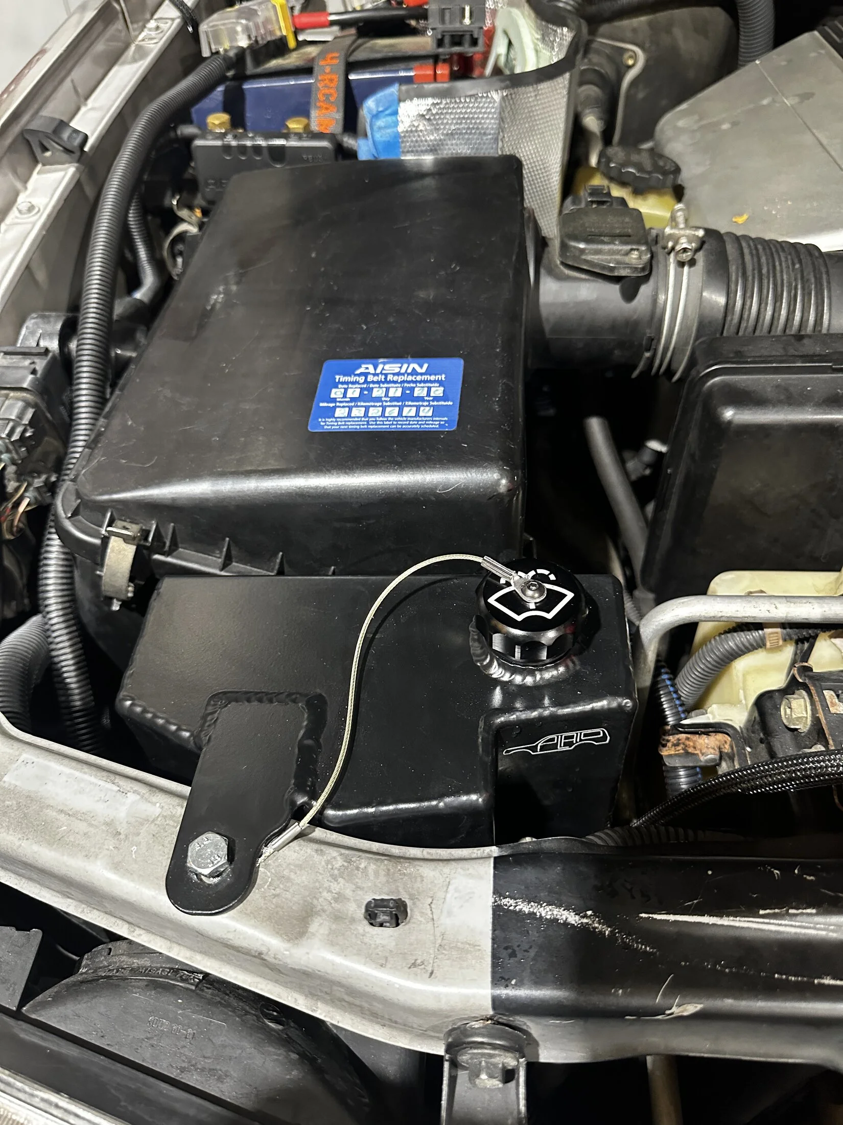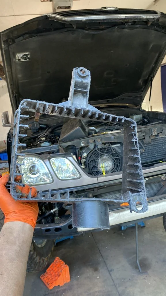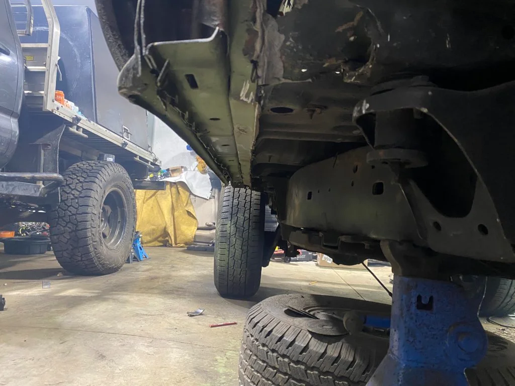 2. Raise the vehicle and remove the front skid plate to gain access to the AC evaporator drain… on the right side of the firewall above the right front sway bar body mount. This is a good time to check and see if the water draining from the AC evaporator has rusted out your swaybar mount. I’ll bet there is some rust… might think about an AC drain relocation kit.