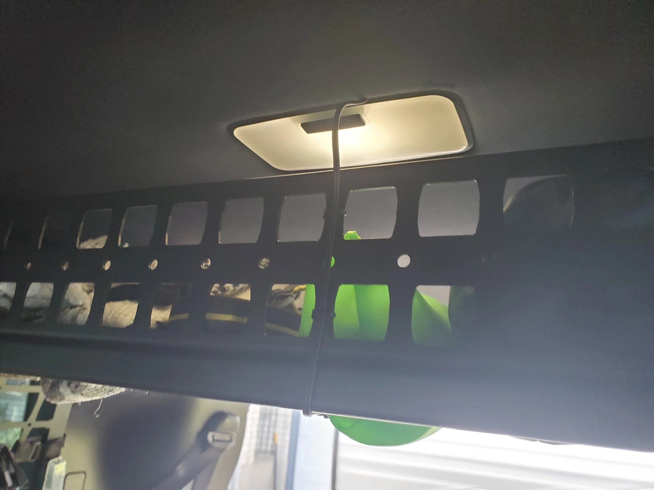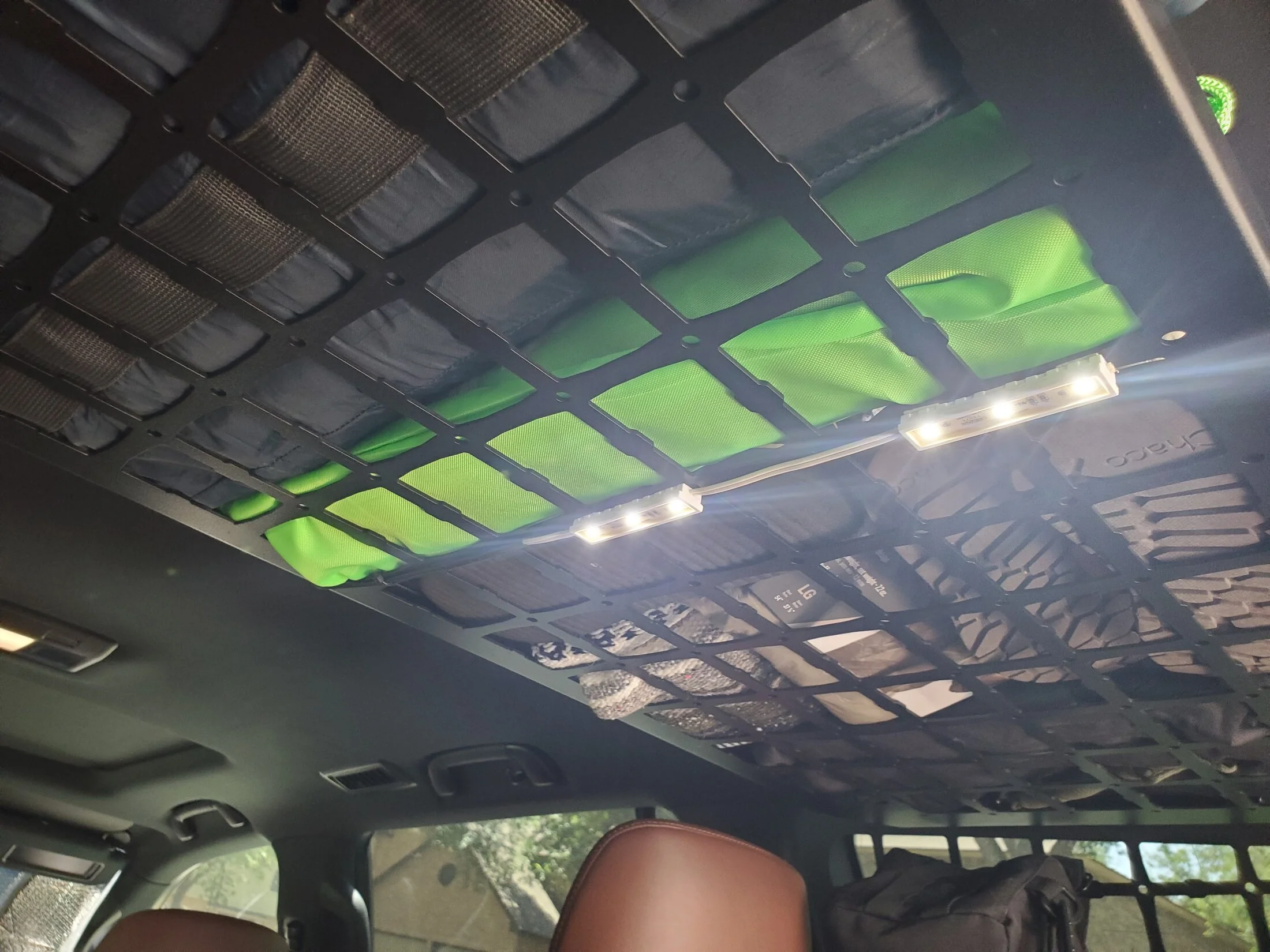 Let there be light... under my shelf. With the cargo shelf and the stuff on it, the cargo dome light was pretty much useless. So I added a few LED pod/string lights. I tapped into the dome light's plug/harness and zip-tied and double sided taped them to the shelf, and they behave just like the factory dome light.