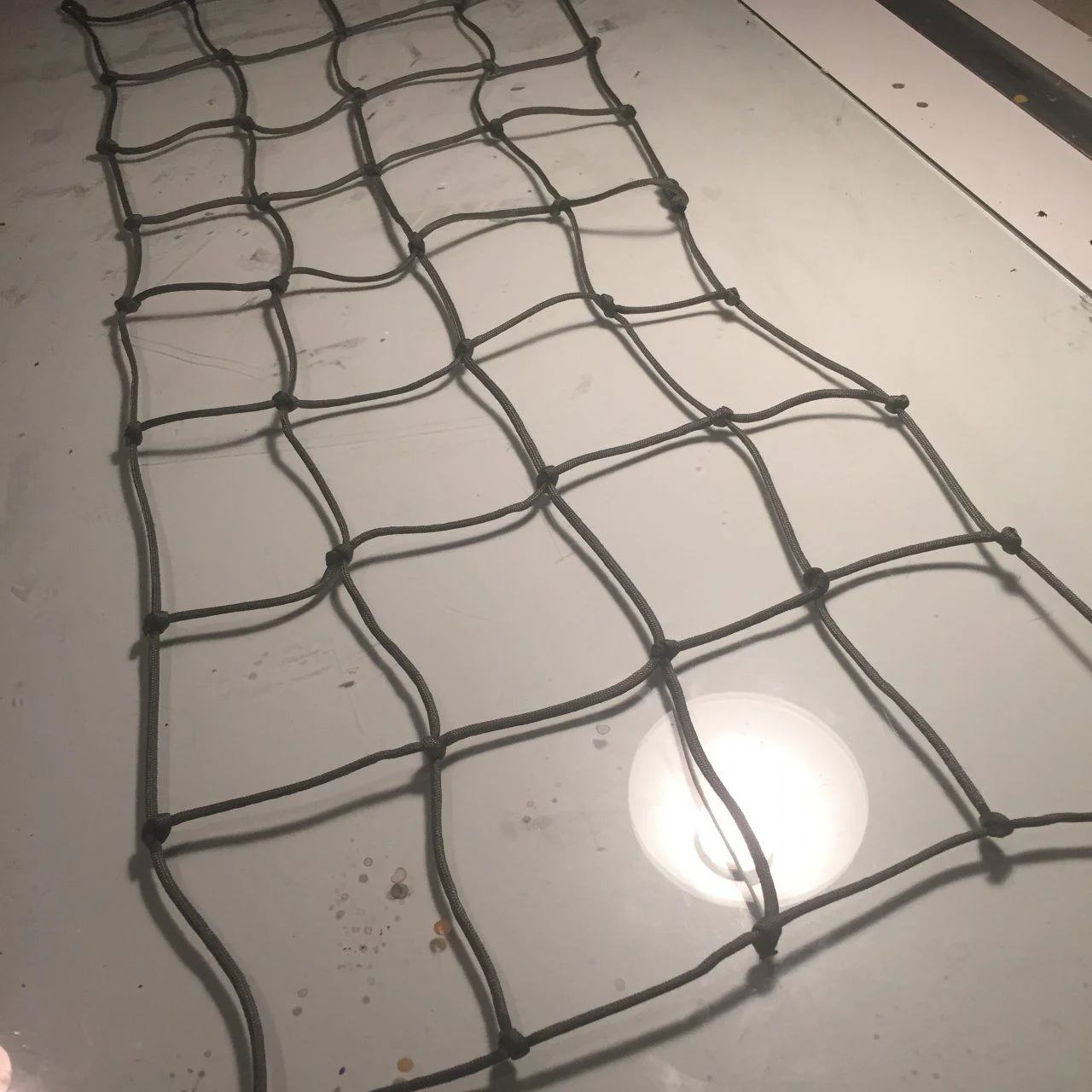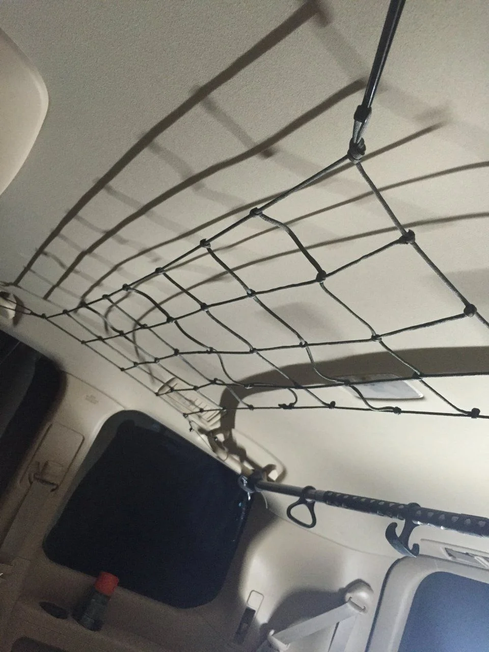 Wanted some overhead storage for the second row for jackets/hats so tied together this paracord net and then just zip-tied it to the grab handles. Will see how it holds up. I had a cargo net thing before but it drooped too much.