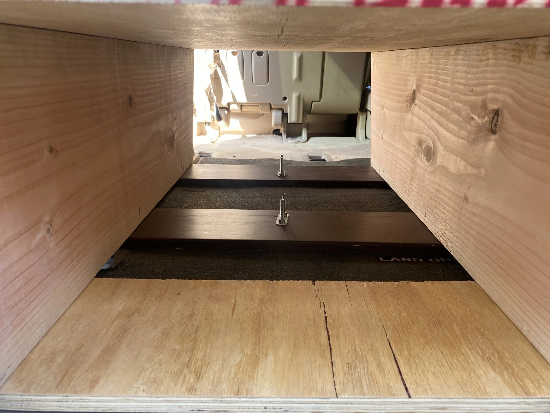 My drawer is constructed of all wood. Top piece is 3/4" thick plywood. Sides are 2x12" And the bottom is 3 - 3/4" wood pieces that cross sideways. For the mounting points where the 3rd row seat would typically latch. I used these 6 nuts and 1/4" bolts to mount the alucab to the drawer. It's plenty strong enough for the tint slide! This is my 3rd or 4th go at making drawer(s) and you learn something every time. The slides are down heavy duty slides I got off Amazon.