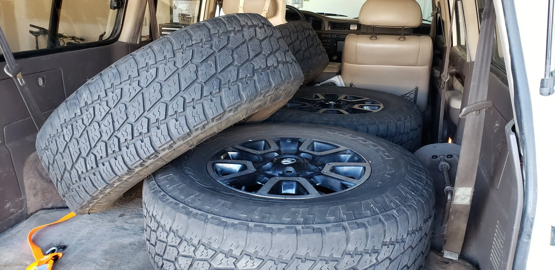 Acquired some wheels and tires. 285/75r18. Planning on AHC service and sensor lift before installing. Two tires are quite good, two have some bad camber wear. Unsure whether I'll run them or replace them, but the price was right.