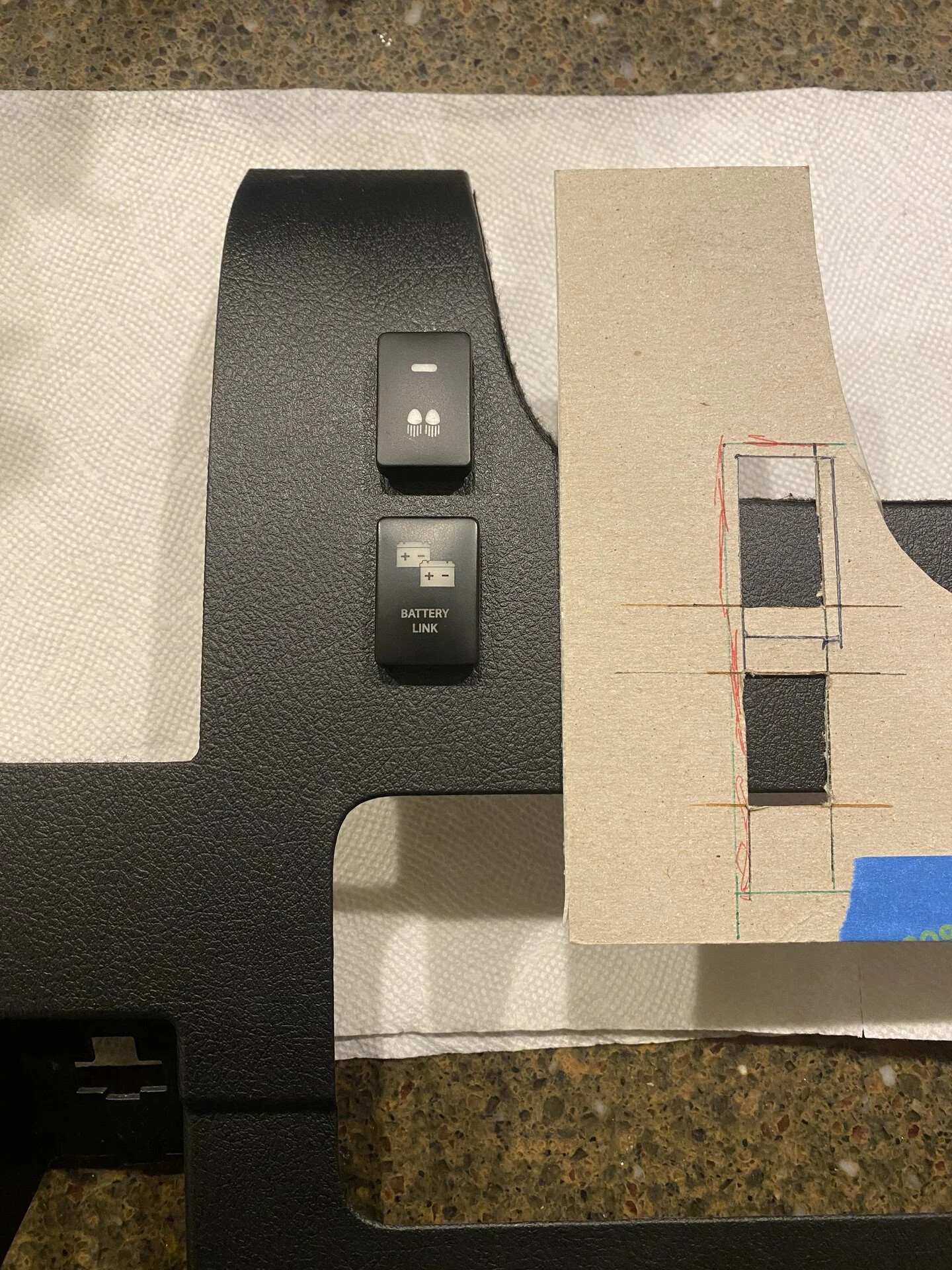 Adding two circuits this week. First a link switch for the Blue Sea ML-RBS 7713 Magnetic Latching - auto release Remote Battery Switch to link an independent auxiliary battery for jump starting or high load needs such as winching. And second a auxiliary reverse light 'lock out' for when the extra lighting is not needed. I was out of real estate on my normal switch positions and looked for somewhere unobtrusive yet reachable.positioning do to the behind the scenes dash framing and mount tab locations. As I had only one shot to destroy the panel, I made a cardboard template and even mounted the switches into position with the template.