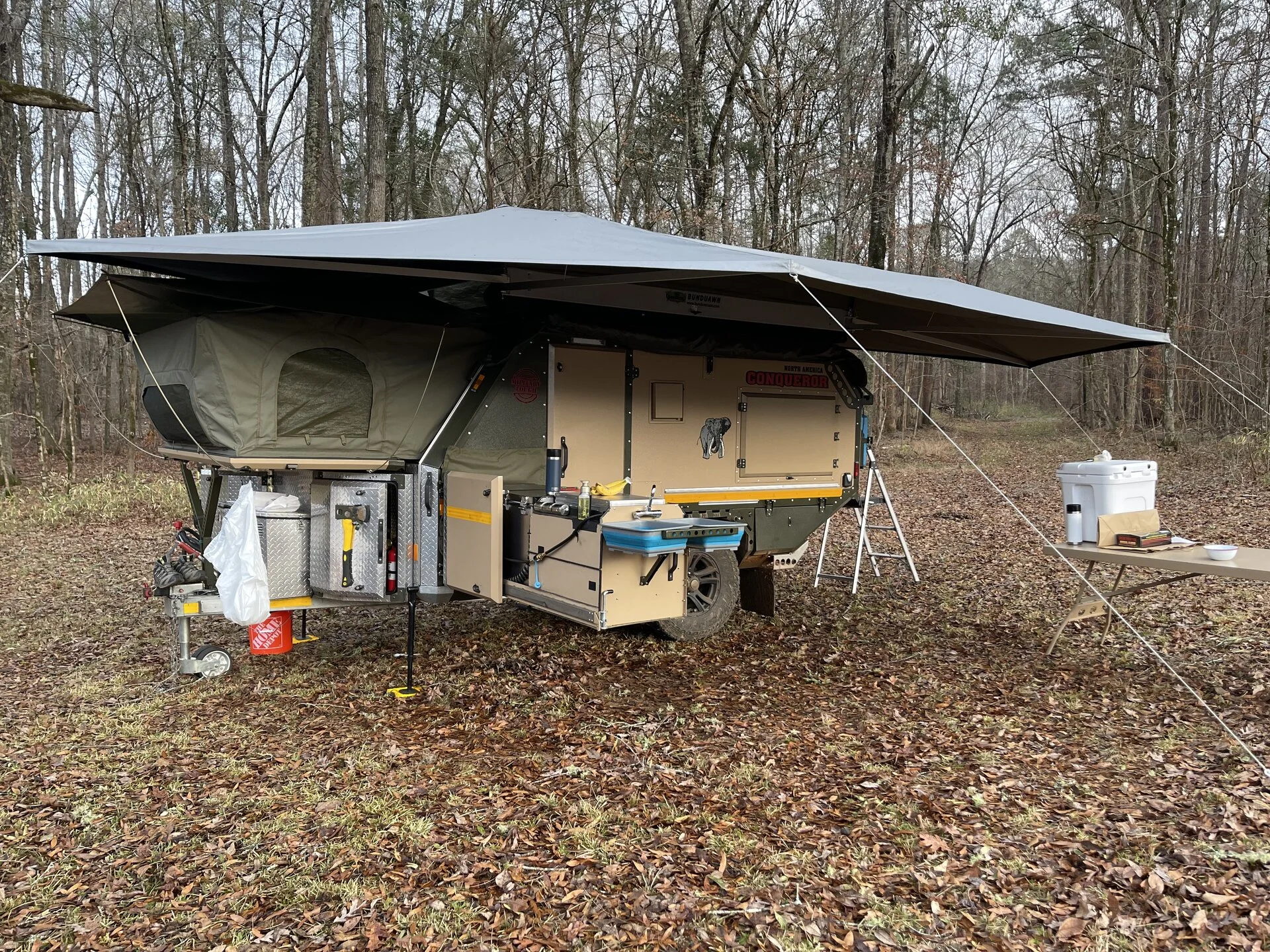 Wow! Thats an awesome setup. Thanks for sharing.Absolutely. It’s a South African built Conqueror UEV490. We got lucky and snagged one off the last container of SA built units, the ones they are bringing over now are made in China and just aren’t the same. Here are some shots of camp with everything open. Typically we go phoneless at this location but I brought our Starlink out to see how it does, lots of obstructions (40% obstructed) but it’s still connecting.