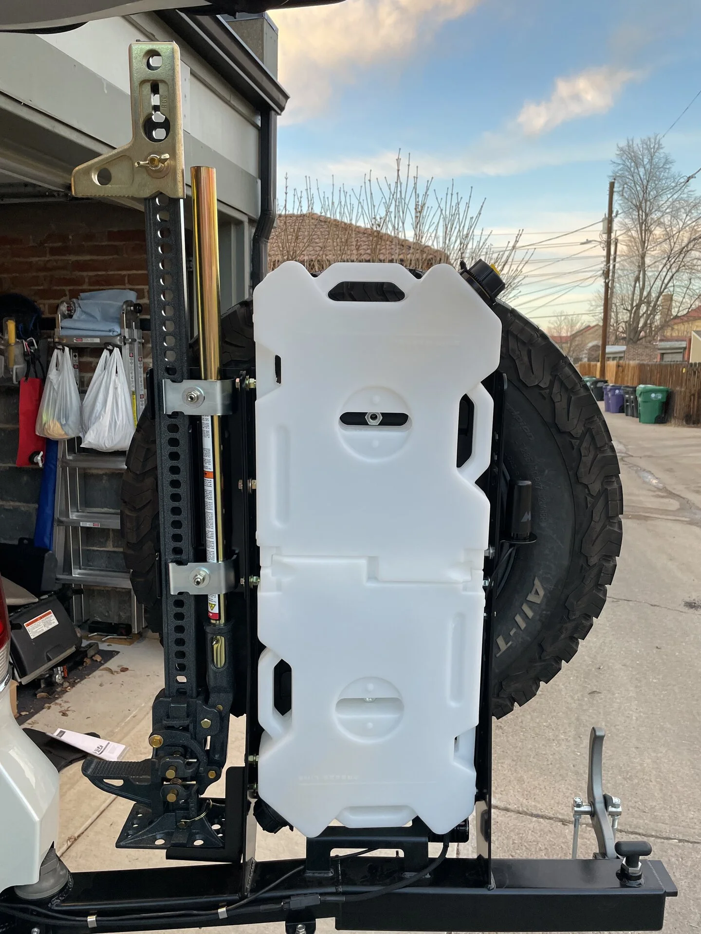 Installed Slee hi lift mount to Slee rear swing out. Works great with existing rotopax mounts once I sourced some shorter bolts. Now that my spare tire side of the rear bumper is optimized it’s time to move to the ladder swing. Thinking of just keeping it bare for now and adding adventure trail gear 5lb propane tank bag and their chainsaw bag to the ladder when on extended trips. These bags help you strap on a 5 lb propane tank and chainsaw and then can be removed while not on trips. Eventually I plan to mount an alu box to the ladder for recovery gear but that will be down the road once the 200 is fully dedicated to exploration. View attachment 3259452