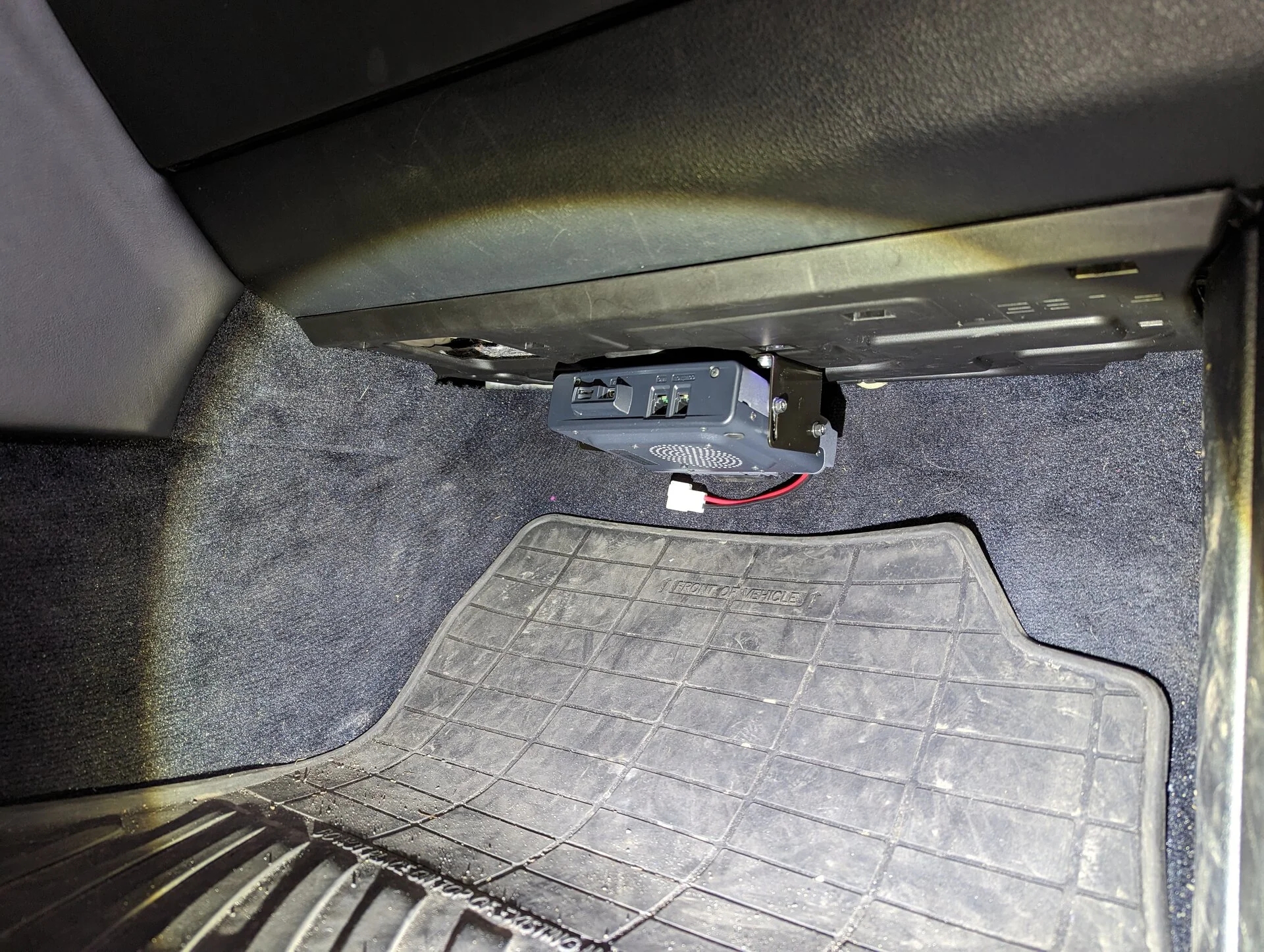 The location options for the radio body seem a bit limited (unless you want to go full remote install). I couldn't find many examples of what others had done, so I thought I'd document my attempt to put it on the passenger footwell access panel. It's nicely out of the way, but it remains to be seen if the location is a good idea or not (I think the panel may be okay holding the weight, but that remains to be proven out).