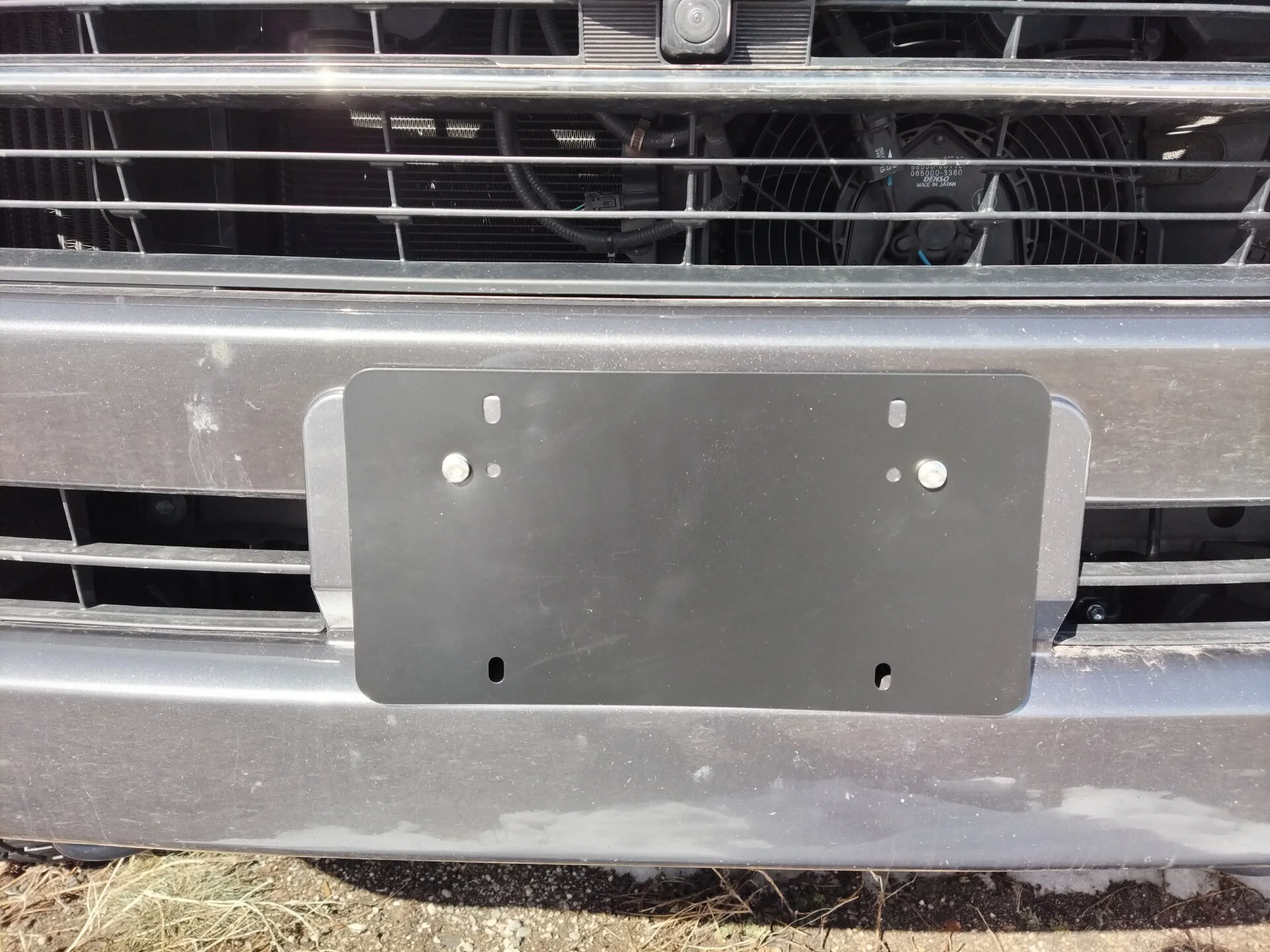 Mounted my front license plate without drilling holes in the bumper using this plate I found at the local Chevy/Subaru dealership parts counter.