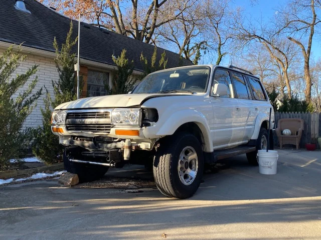 Weve been steady tinkering on little things and it goes to the shop to get is new engine this week. It's all hooked up ready to delivery. Weve got the bumper, winch, & ARB lift kit for when the engine work is done. The 9th grader scored come quality used tires and prepped/painted/cleared the factory wheels. Shooting to have it back on the road before school starts so he can mosh in the HS parking lot.Heres a little before and after as we make this FZJ80 tow-able.
