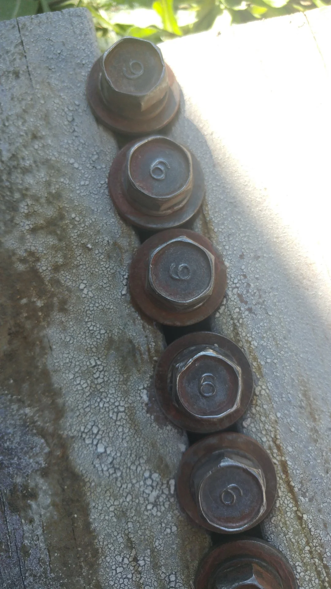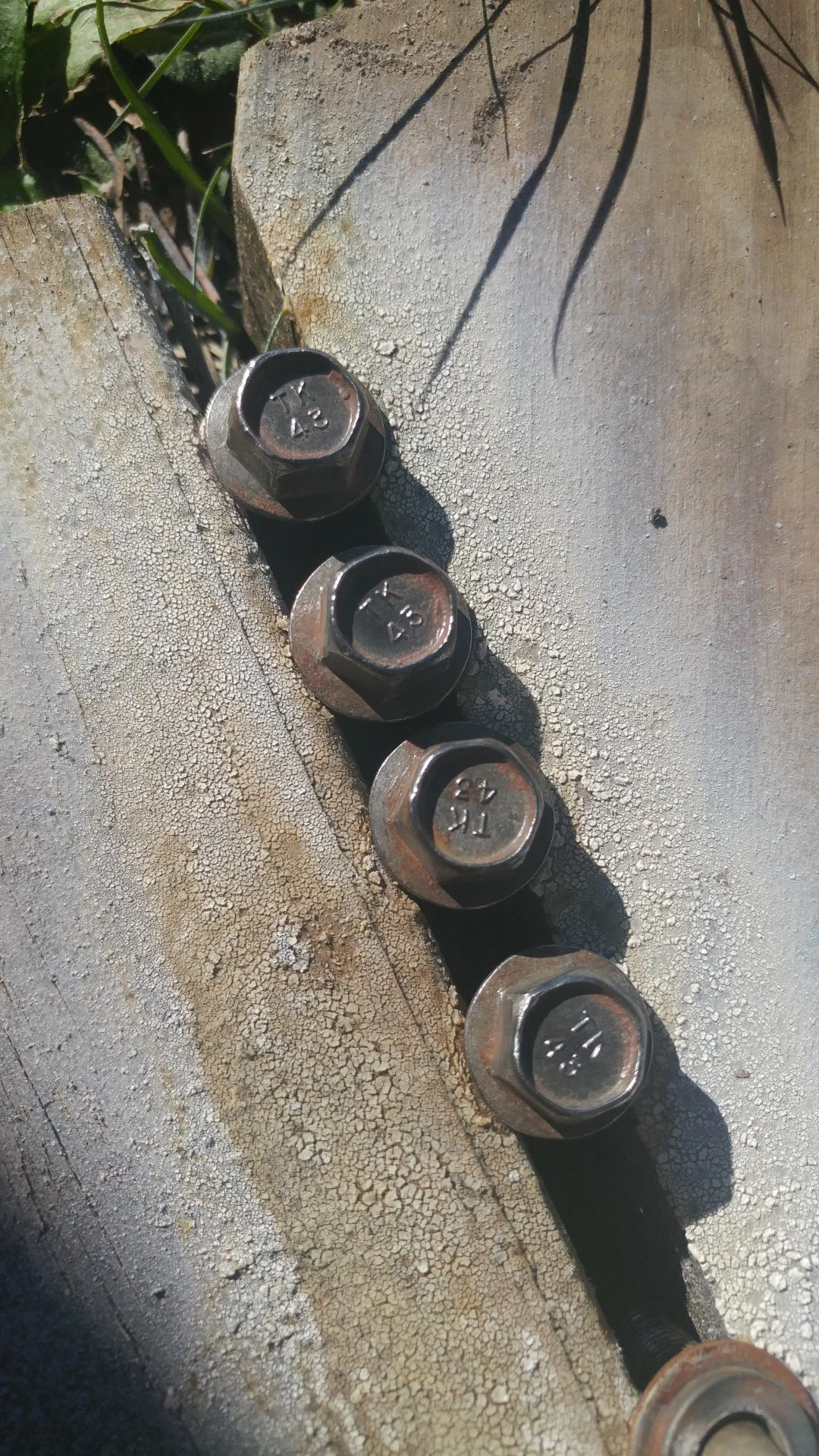 I ran into something that I didn't know about the rollbar bolts, so I got on the forum to try to find the answer. Surprisingly I found about 4 threads asking the question, but without a real clear answer, so I want to drop some rollbar bolt 101 stuff right here that I figured out. So, each downpost has 4 bolt holes. 3 of them are standard fare, M10-1.25 bolts, original part number 91651-61025, 12 needed. These are marked with a 6 on the head (maybe 9). They are available to order from Toyota, but I ordered some in December that still haven't shown up, so I cleaned up the original ones.
