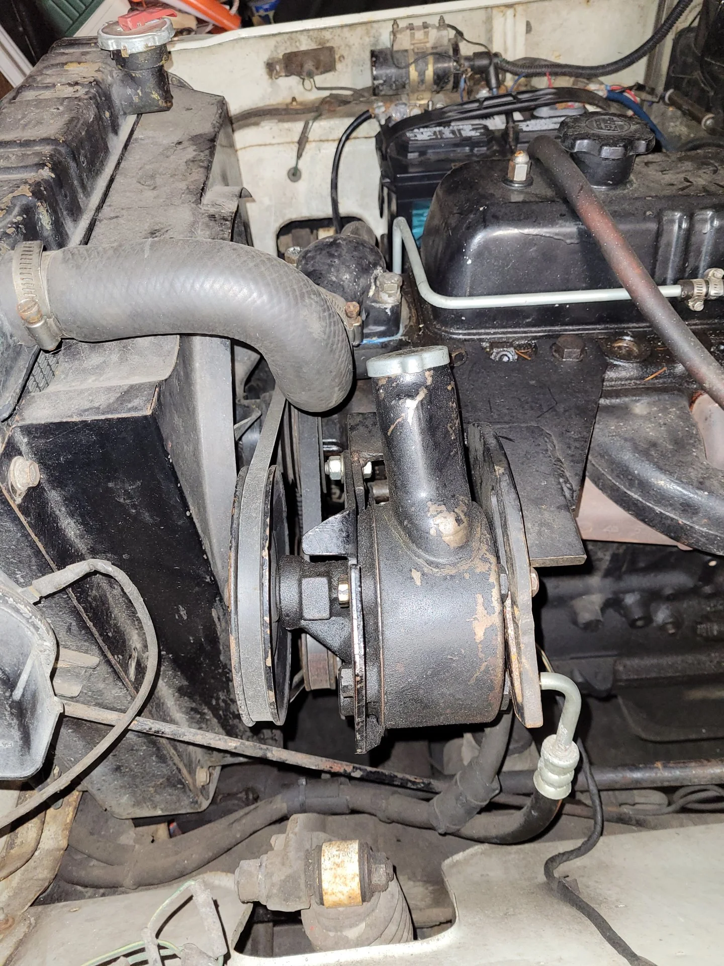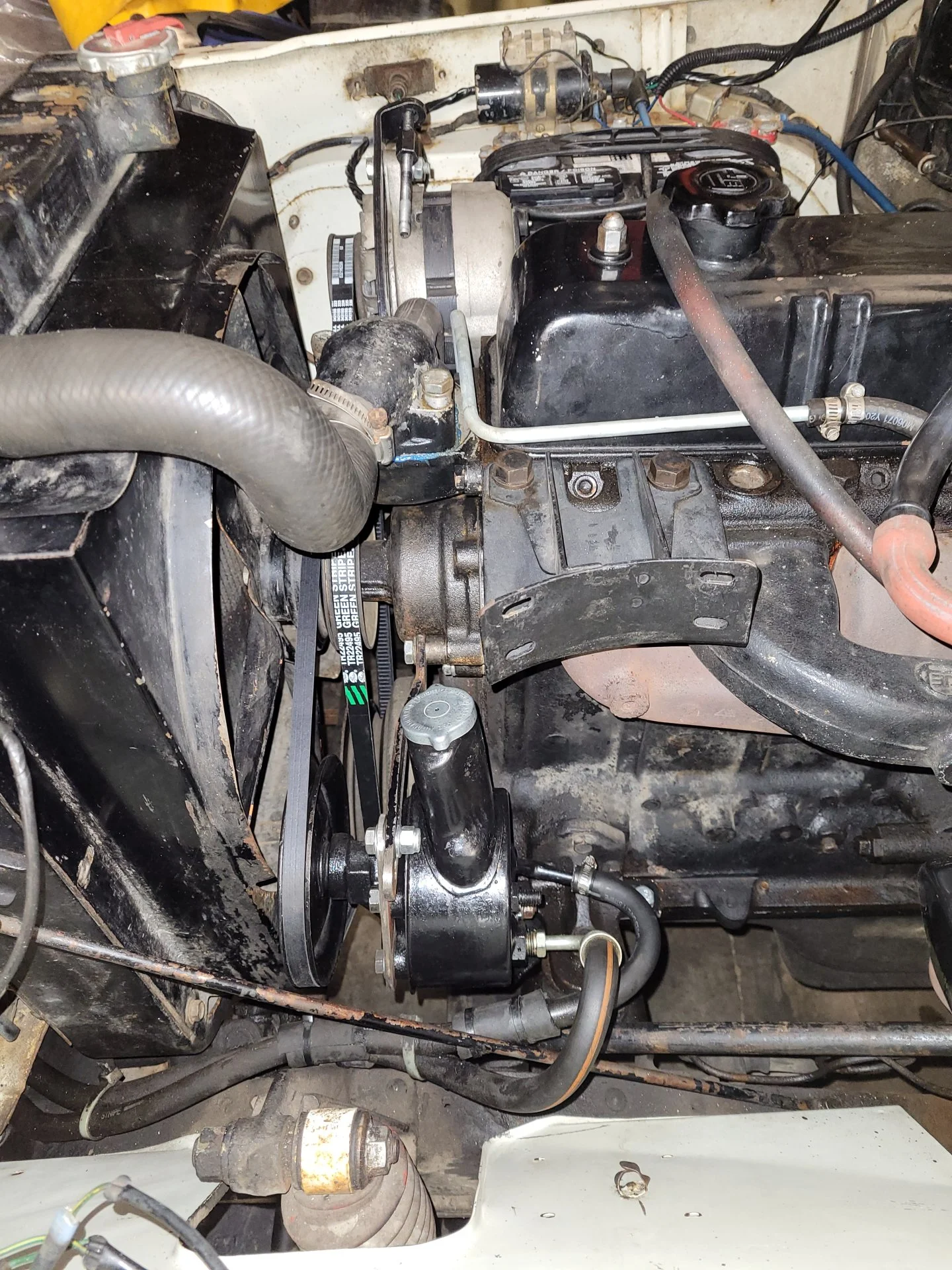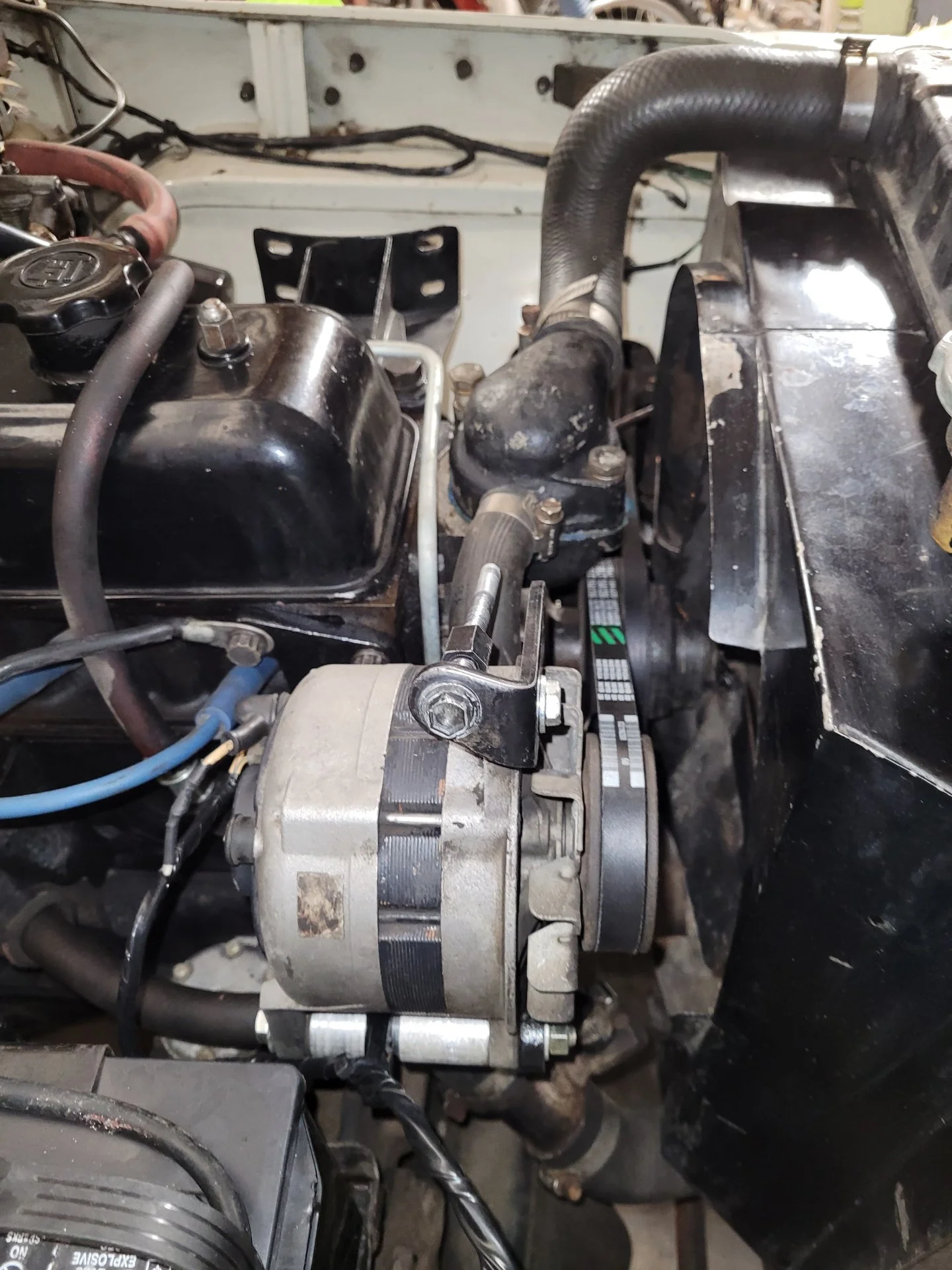 Moved my stock "F" alt to passenger side with a factory mount, belt did not line up when mounted as stock, so I made some spacers which allowed me to avoid buying a diff alt. Belt is good