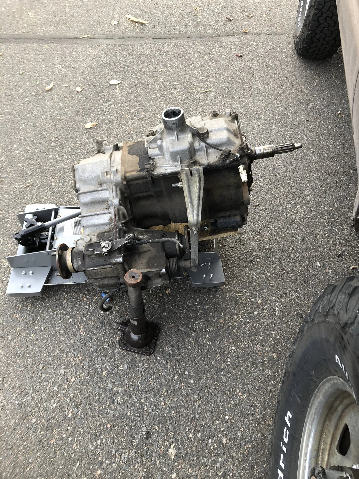 @Hokie LXMan, cut you a piece of plywood and bolt it to the jack. Drill out some holes in the plywood to accept the studs from the trans mount. Prop up the t case. Drop the cross member, leaving the mount attached to the trans. Bolt the trans mount to the plywood and then you have a rock solid support for dropping and stabbing that baby! No more sketchy ratchet straps or tipping. Here are the best pics I have of this setup. Pulled the 4 speed. Swapped on the 5. Built the tcase on the jack. Stabbed it myself in two takes. Can’t reiterate enough how handy this setup is! Makes trans work a breeze!