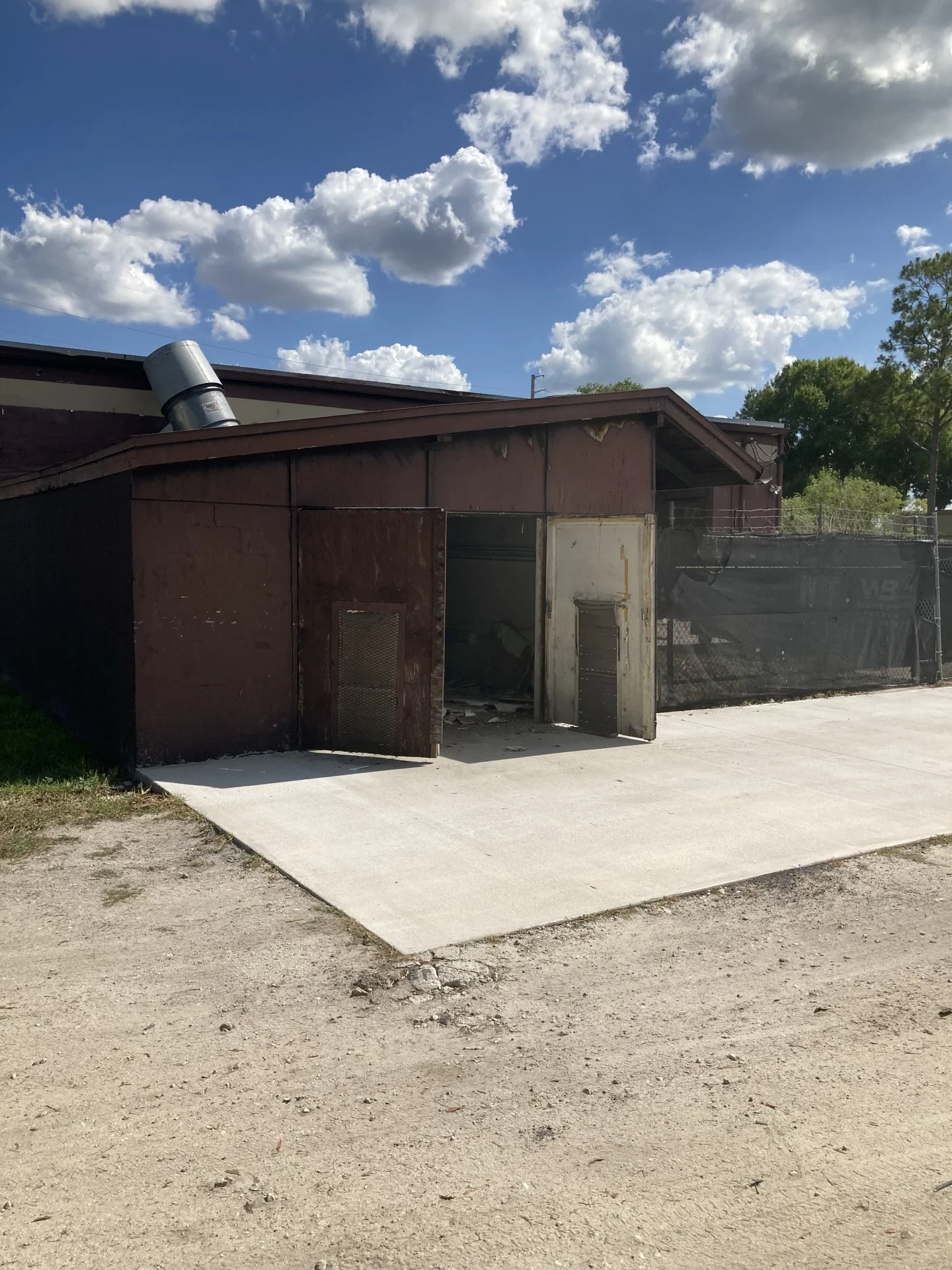 First thing is getting right to cleaning this place up. First order of business is ripping that nasty wood siding and soffit off the west exterior side. Everything else is bare concrete and will be painted fresh white along with the interior and ceiling.