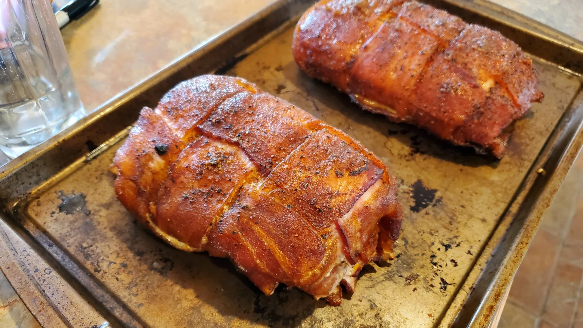 Smoked at 250 indirect for a couple of hours. Pulled at 150 internal temp. Ramped the temp up to about 350ish direct to crisp the bacon a tad more.