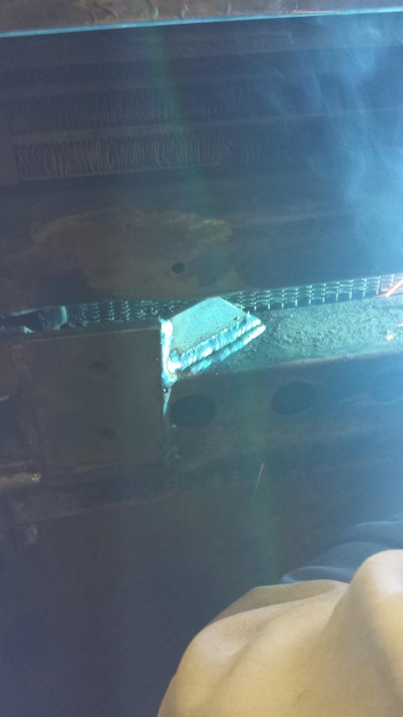 After welding the plates in place we cut some gussets, welded them in and rewelded some of the areas where the crossmember mounts to the frame. On the gussets that we made on the inside of the new plates we angled the gussets back at an angle to help support the plates. Since the metal on the crossmember was so thin we laid down 3 rows of bead to grab more surface area.